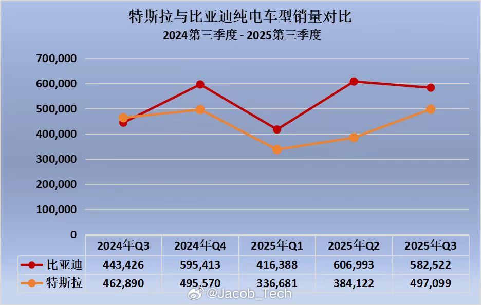 数据说话才够硬!2025 年 Q3 比亚迪纯电销量飙到 58.25 万辆,直接比特斯拉多卖 8.54 万辆,前三季度纯电累计销量近 160.6 万台。更狠的是 Q1,比亚迪狂卖 100 万辆新能源车,其中纯电 41.64 万辆,而特斯拉同期才 33.67 万辆,差距肉眼可见