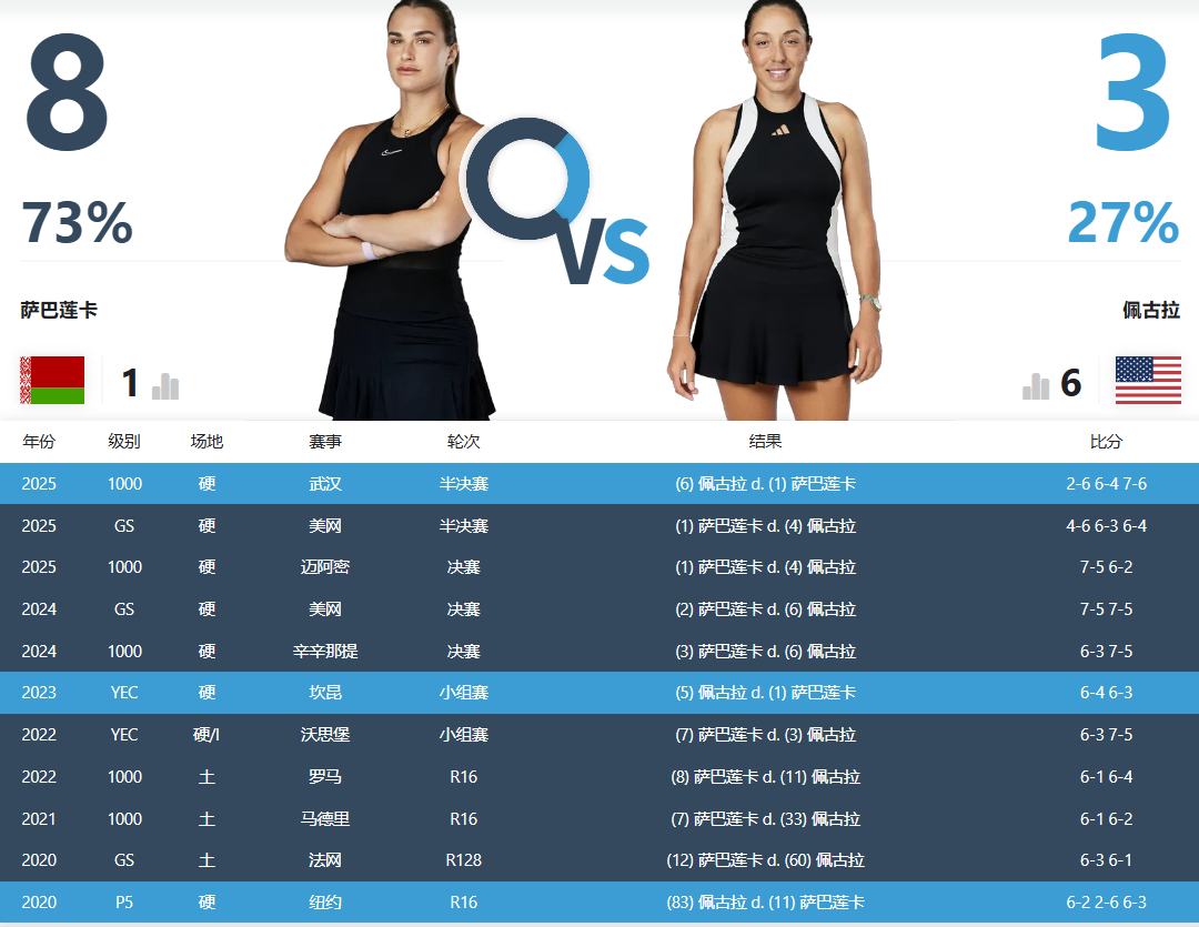 佩古拉终于赢了!和萨巴伦卡的交手记录改写为3-8!