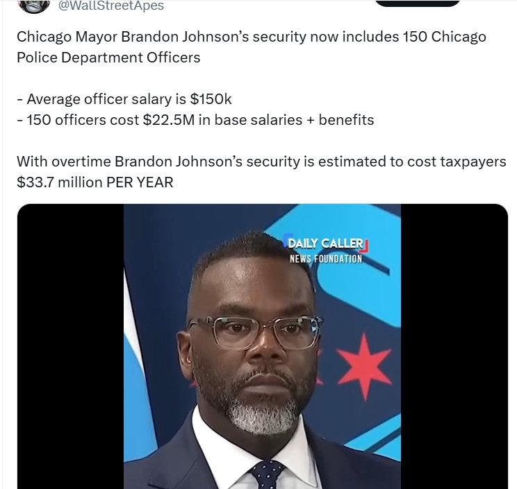 美芝加哥市长布兰登·约翰逊的安保团队现在包括150名芝加哥警察局警官 • 平均每名警官的薪资为15万美元 • 150名警官的基础薪资加上福利共计2250万美元 加上加班费,布兰登·约翰逊的安保费用估计每年将使纳税人承担3370万美元的成本。