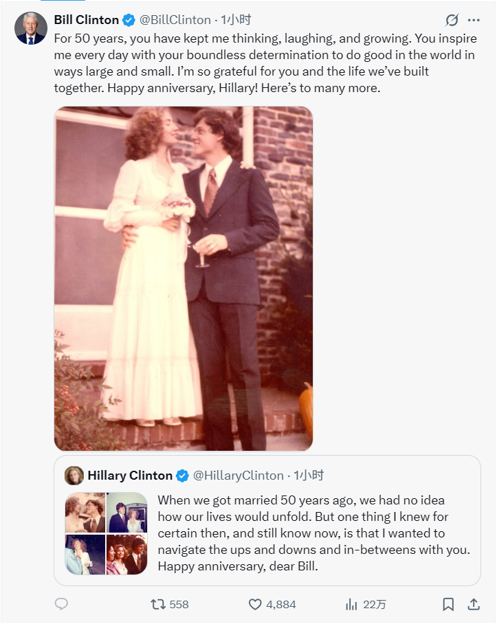 刚刚,克林顿和希拉里一起发帖,庆祝俩人结婚50周年。俩人评论区现在都是关闭状态。