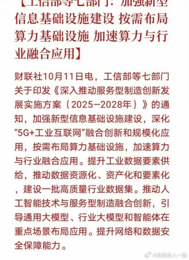 ​下午4点39分消息,工信部等七部门发布消息,关于加强新型信息基础建设、推动算力与行业融合应用方案,算力基础板块迎来大利好消息,工业互联网迎来重大利好。