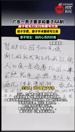 【男子坚持AA妻子手术要打欠条】丈夫坚持AA制妻子无力支付要写欠条 近日,在广东一对夫妻的婚姻中,丈夫坚持家庭所有开支必须严格AA制。妻子除承担自己的一半开销外,若一时无力支付,连孩子的学费、自己看病的钱,都只能向丈夫写下欠条。妻子无力支付手术费只能写欠条!“账本式婚姻”引热议,这样的感情还算是爱情吗?