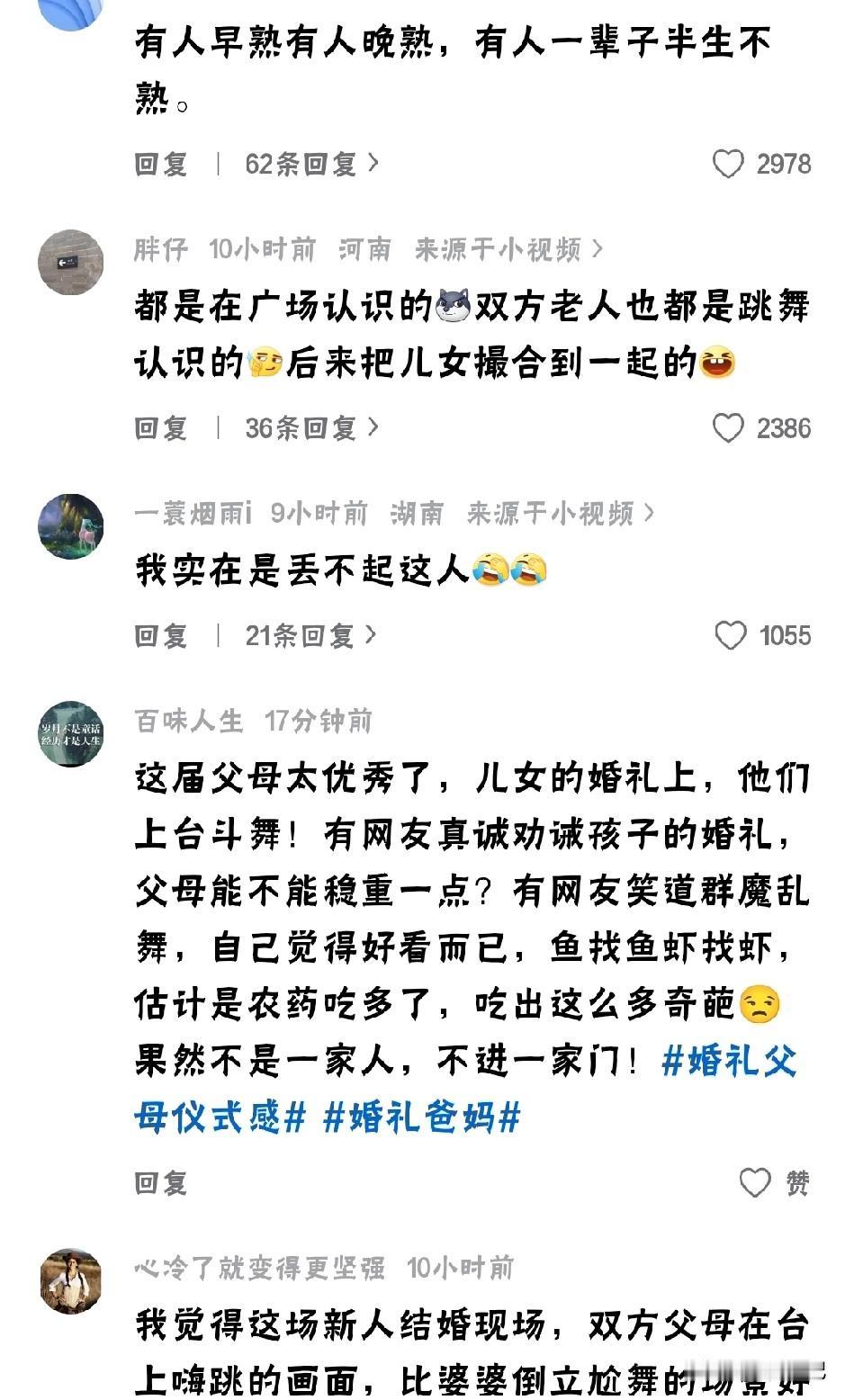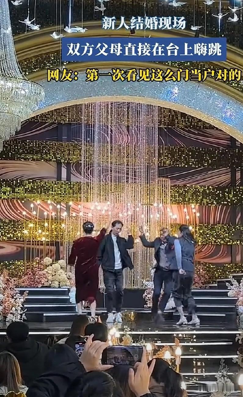 两对老人是不是嗨过头了, 儿女结婚, 亲家四人在舞台上尬舞好嗨呦, 用感觉有点尬, 网友一致认为还稳重点好。 不过从现场图片来看, 两家生活应该挺富裕的。 不知道网友说的对不对, 是不是跳广场舞时认识, 介绍儿女结婚的。 新人婚礼双方父母在台上嗨跳