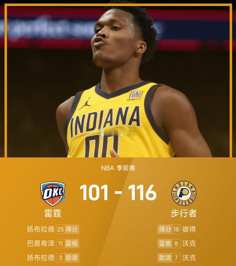 25/26赛季NBA季前赛,步行者对阵雷霆。双方全场战罢,步行者116-101战胜雷霆。彼得得到18分5板4助率队取胜,扬布拉德空砍全场最高的25分5板3助。