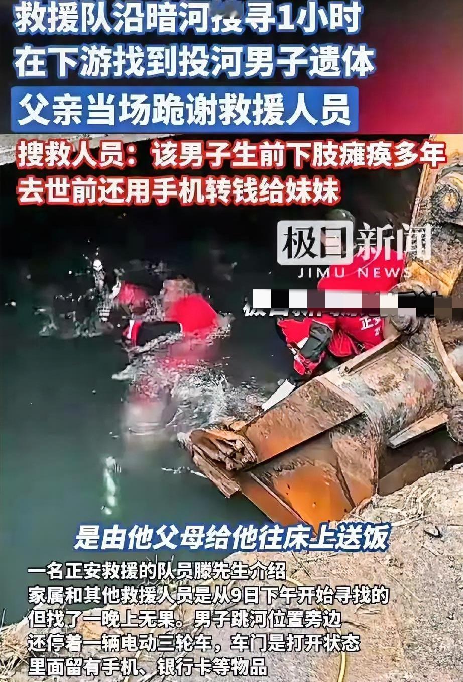 下肢瘫痪多年的大哥,最后选择投河,可走之前还把手机里的钱全转给妹妹,银行卡、手机整整齐齐放河边,连身后事都替家人考虑得明明白白。 邻居说他以前还能拄拐挪两步,后来严重到吃饭都得爸妈端到床上。他哪是怕自己遭罪啊,是看着老两口一把年纪还得伺候自己,心里熬不住了。救援人员找到人时,他爸“咚”地就跪下了,那一下哪是跪啊,是把这辈子的心疼都砸在地上了。 有人说“尊重他人命运”,可我总觉得,他不是想放弃,是太懂事才逼自己放手。要是咱们身边有这样的人,多句关心、搭把手,会不会能让他们多撑一会儿?你们觉得,怎么才能让这样的困境者少点绝望呢?