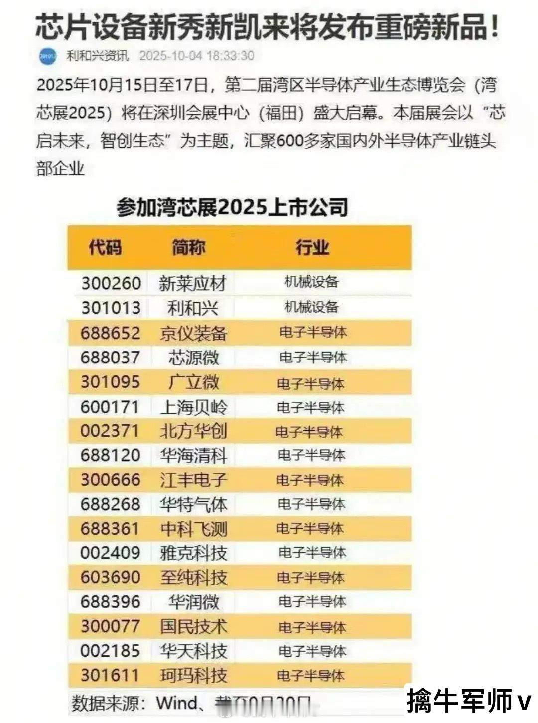 10月15日~17日,湾芯展2025将在深圳开启,汇聚超600家半导体产业链头部企业,新莱应材、利和兴等众多上市公司也将参与,芯片设备新秀新凯来将发布重磅新品!(本次博览会部分核心参会公司名单见配图)