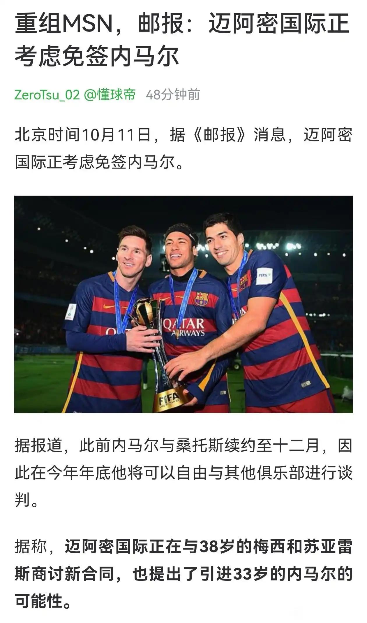 梅西真是重情重义,迈阿密国际要签内马尔,这个队真是巴萨养老队。 布茨克茨刚在此退役,苏亚雷斯还在呢,MSN重新聚首,没伤病就冲击冠军。 隔壁C罗还不是召小弟菲尼克斯过去么。 大哥带小弟,梅西也有小弟,都是好队友![偷笑]