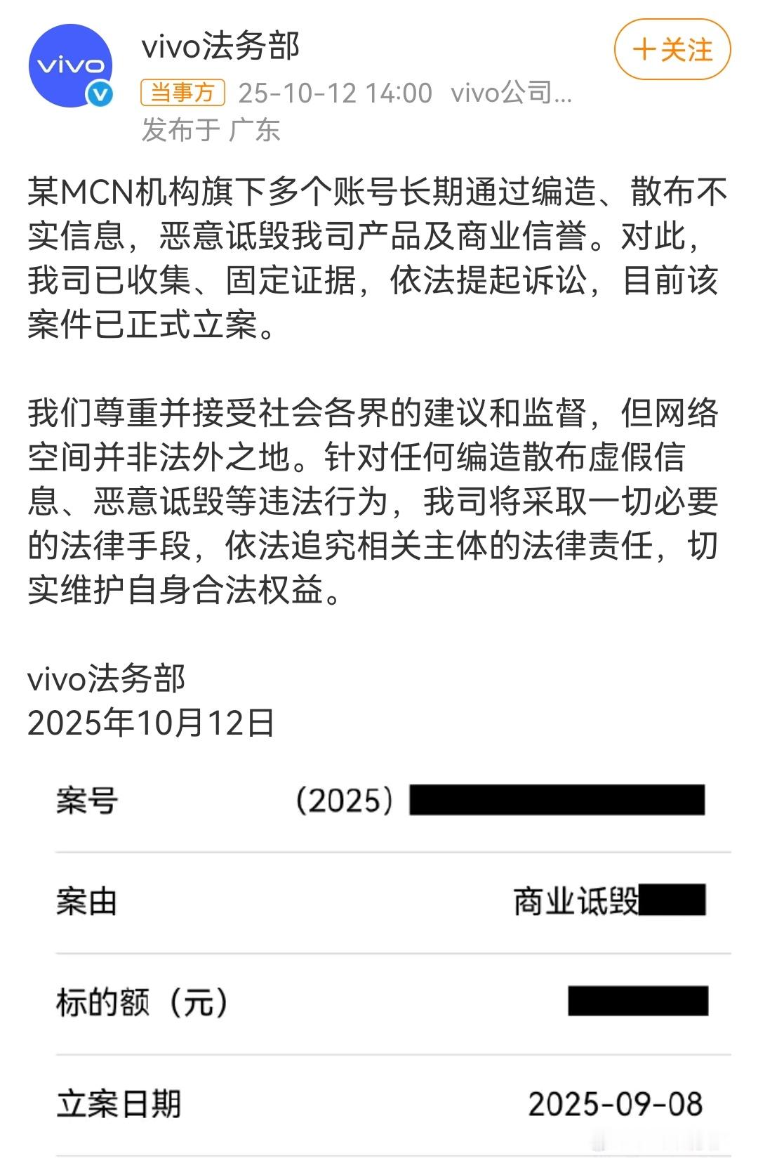 vivo起诉某MCN诋毁索赔近千万一向温柔的蓝厂法务也被迫维权了,好奇这都是什么