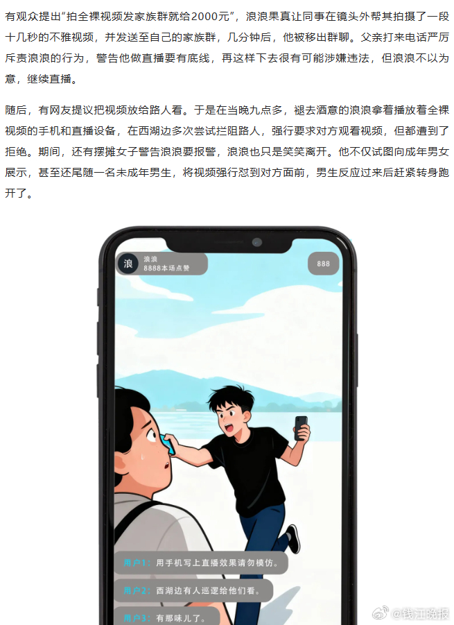 有粉丝提出“拍全裸视频发家族群就给2000元”,浪浪果真让同事在镜头外帮其拍摄了一段十几秒的不雅视频,并发送至自己的家族群,几分钟后,他被移出群聊。