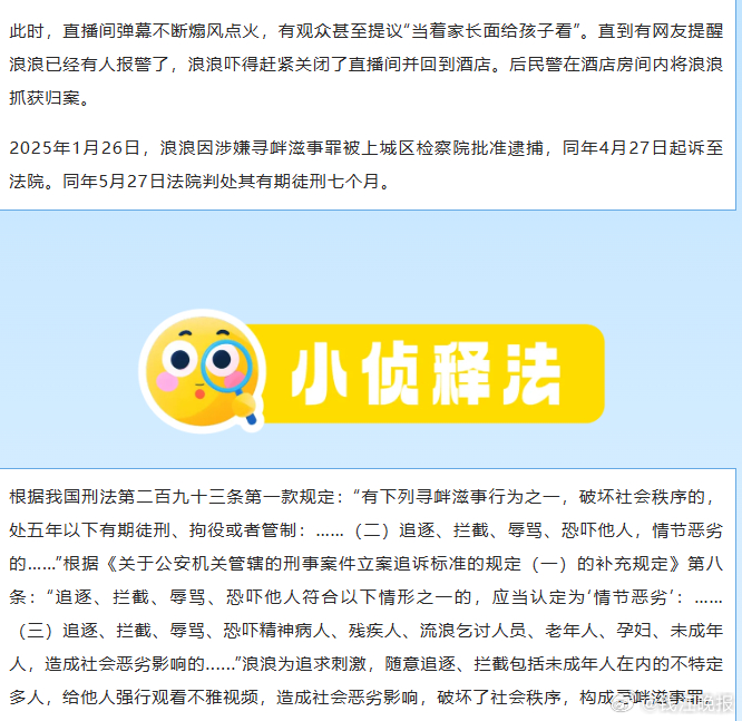 2025年1月26日,浪浪因涉嫌寻衅滋事罪被上城区检察院批准逮捕,同年4月27日起诉至法院。同年5月27日,法院判处其有期徒刑七个月。(上城检察)