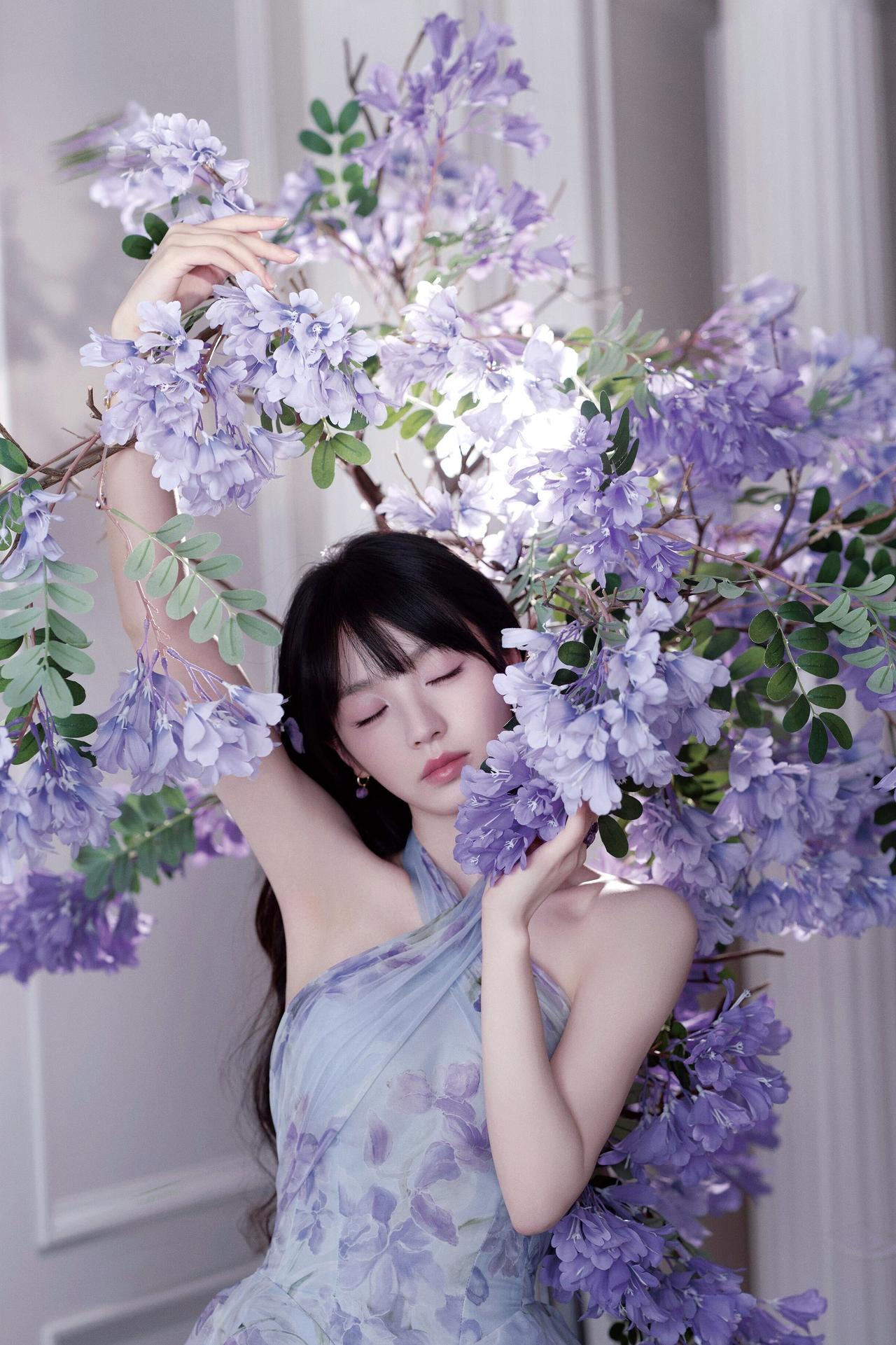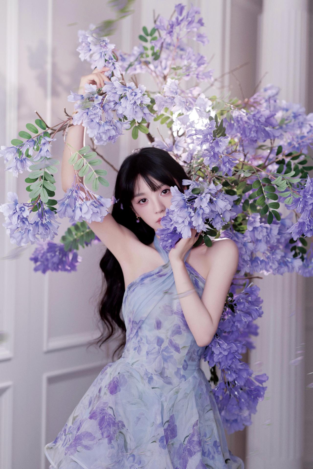 《紫花笺》 浅紫的花瀑倾泻下来,她是花中走出的精灵。 薄纱裙裾上的花影与枝桠间的