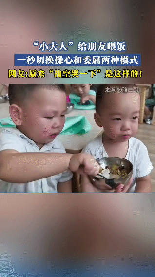 某幼儿园到饭点啦,“小大人”要给同学喂饭。一开始,他可操心了,苦口婆心地劝:“你别哭了。”结果喂着喂着,自己委屈劲儿上来了,抽空就哭一下,那小模样,仿佛在说:“我都这么努力喂你了,我也难过呢!”而同学呢,哭着哭着还抽空吃两口,这俩小家伙,简直把“操心”和“委屈”的模式切换得明明白白,让人看了又心疼又想笑。年纪大的小孩 小孩喂饭 五岁的小大人 萌娃