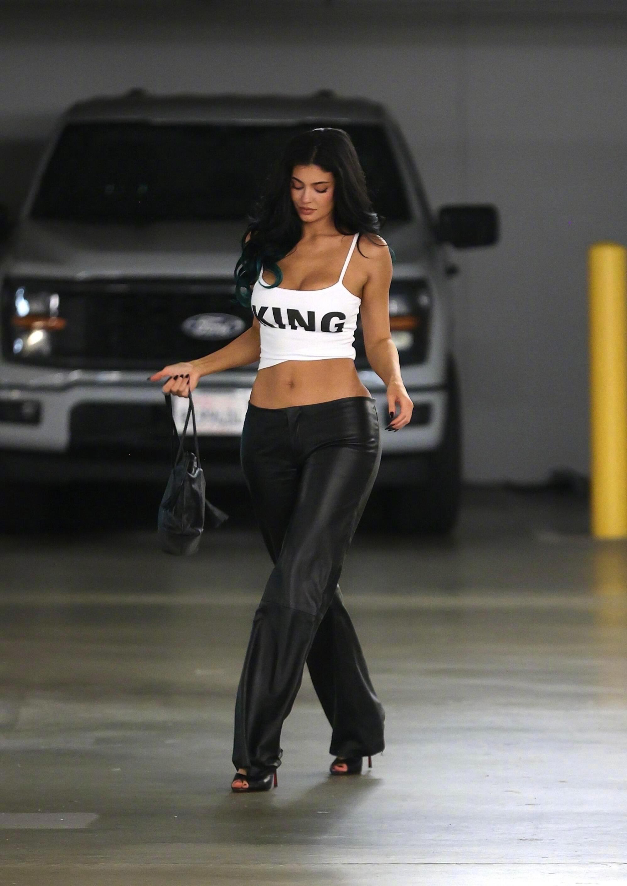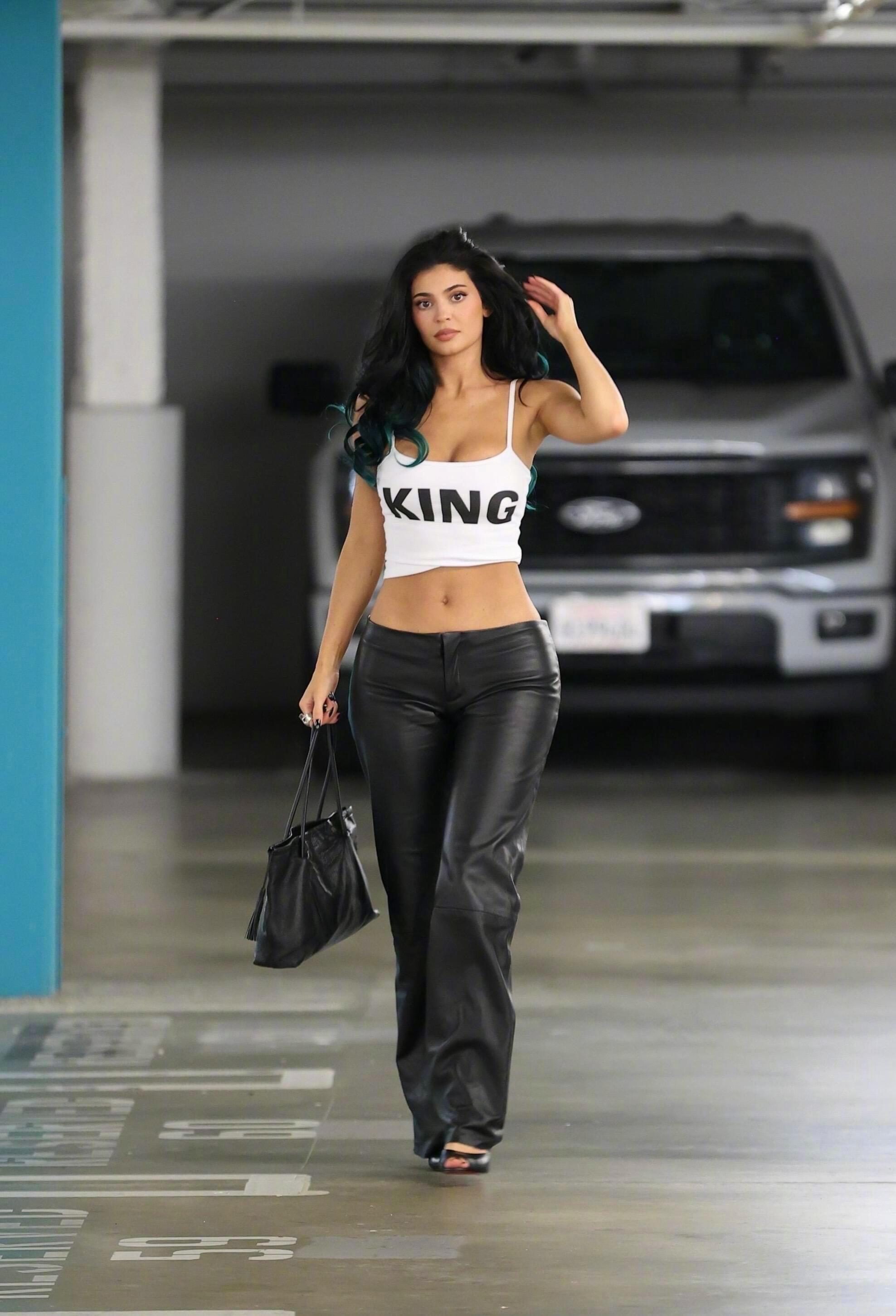 凯莉Kylie Jenner 性感外出的街拍。这种无腰裤,她穿都往下滑,普通人是真没法穿[笑而不语][偷笑]。手拎的是 Gucci( by Tom Ford )蛇皮抽绳流苏黑色单肩包。米拉服饰解析
