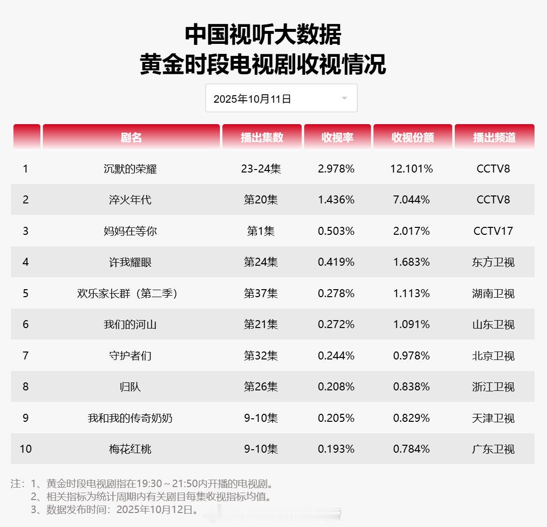 【2025年10月11日中国视听大数据CVB黄金档电视剧收视率日榜TOP10】1