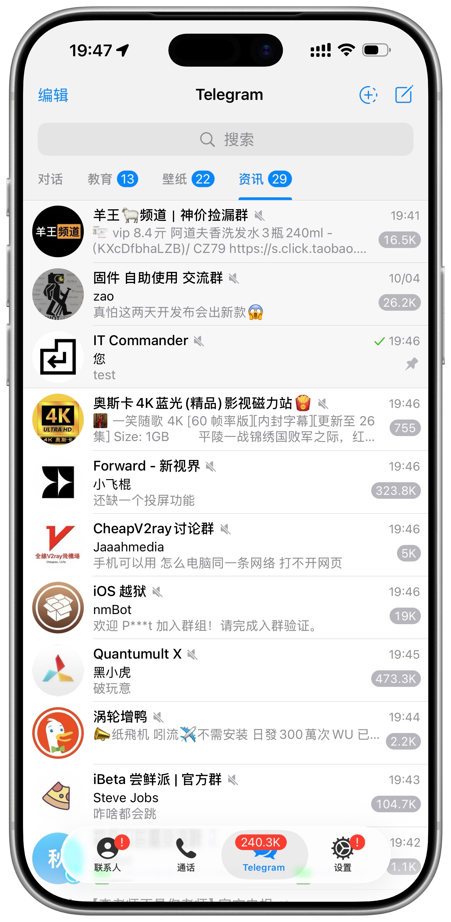 telegram正式版支持iOS 26 液态玻璃底栏了。