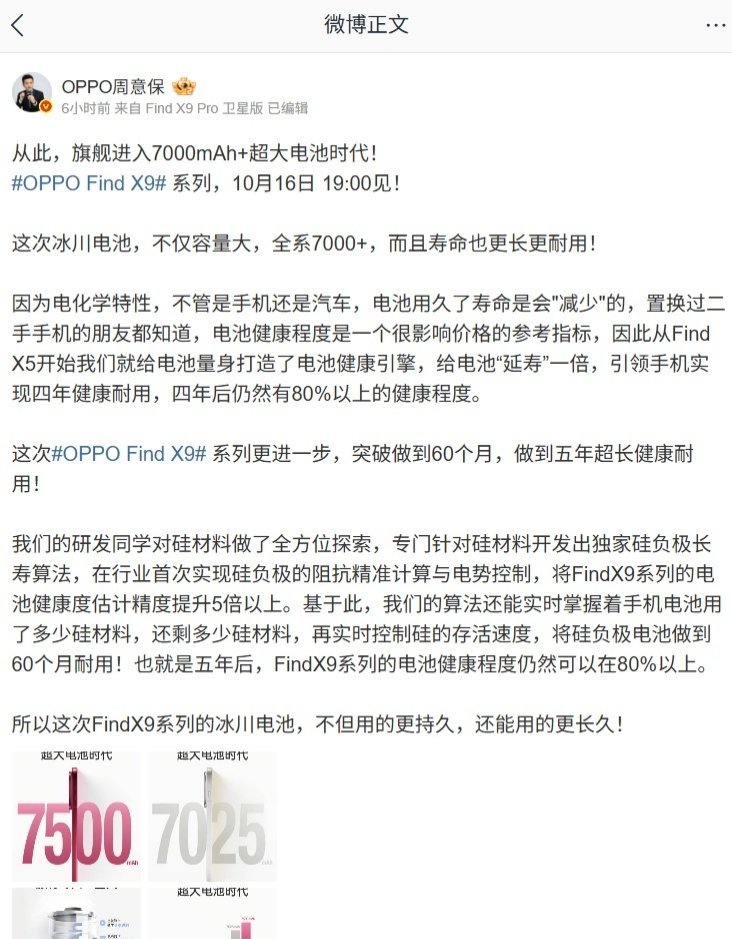 【OPPO 官宣 Find X9 系列搭载超 7000mAh 电池,五年健康程度 80% 以上】