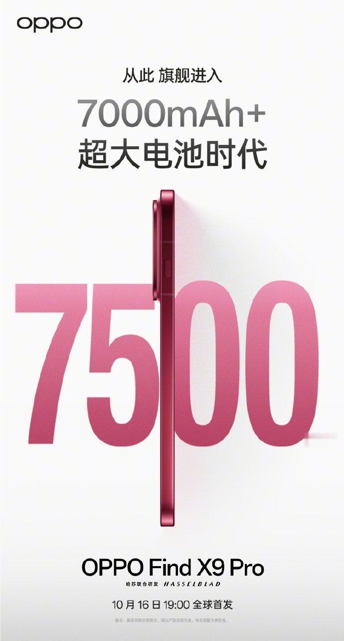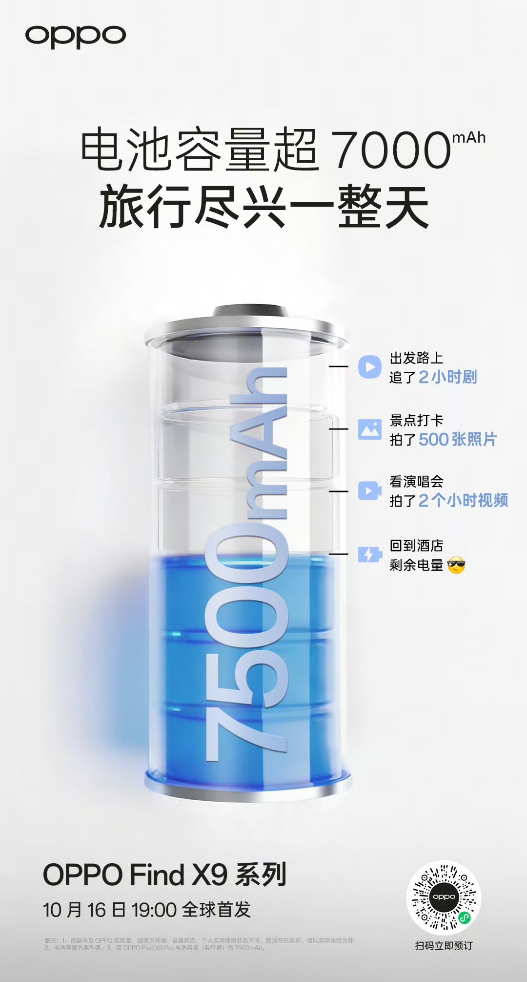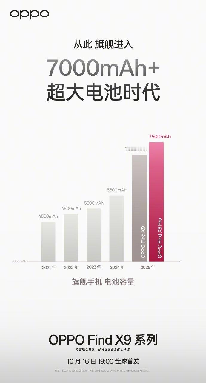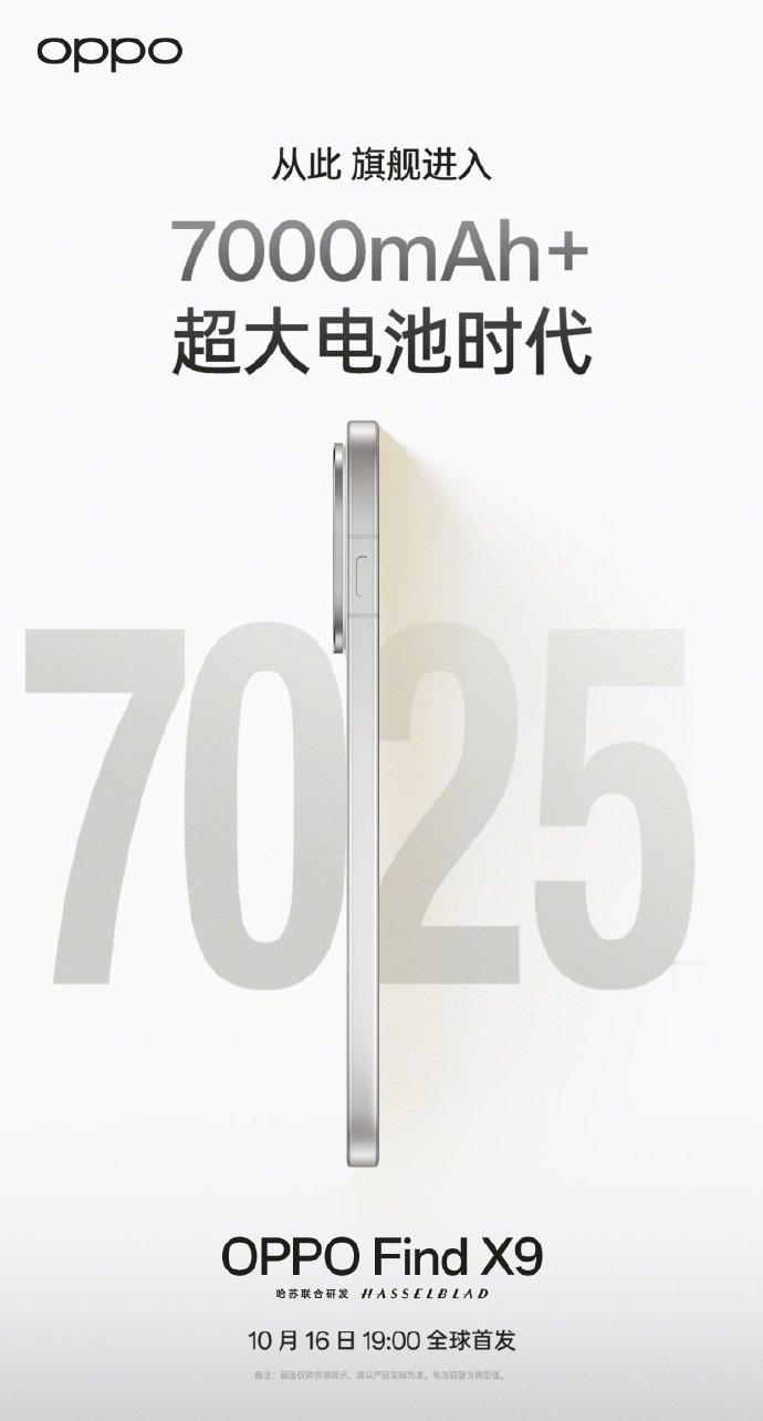 OPPO 官宣 Find X9 系列手机搭载超 7000mAh 电池,其中标准版 7025mAh,Pro 版 7500mAh,10 月 16 日 19:00 见。