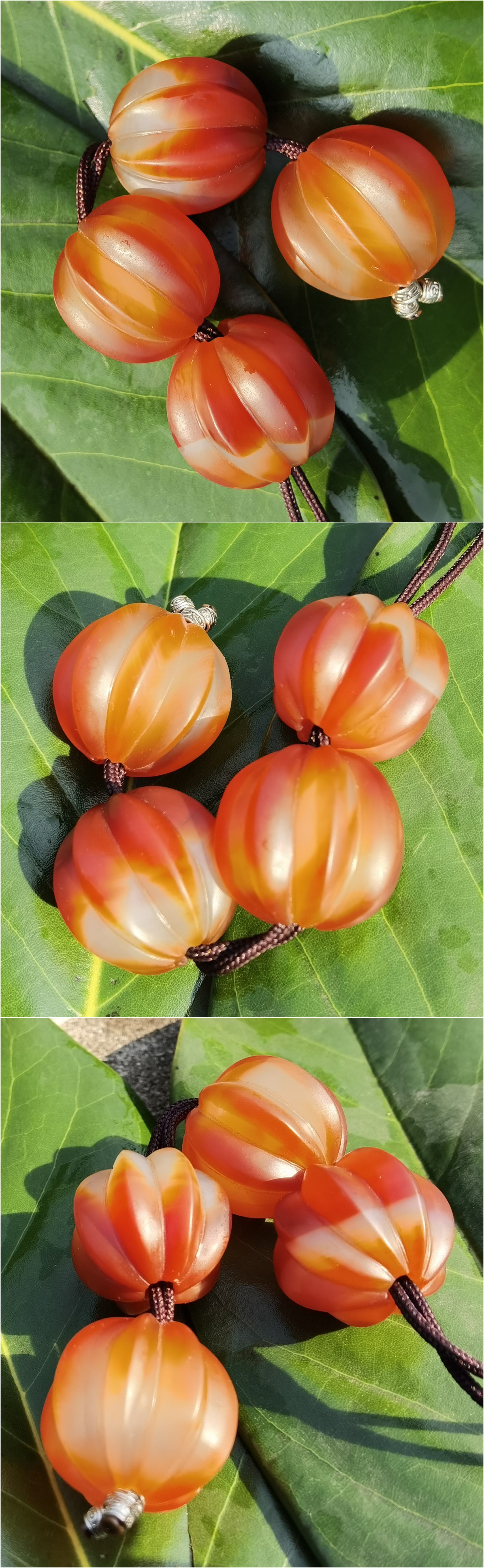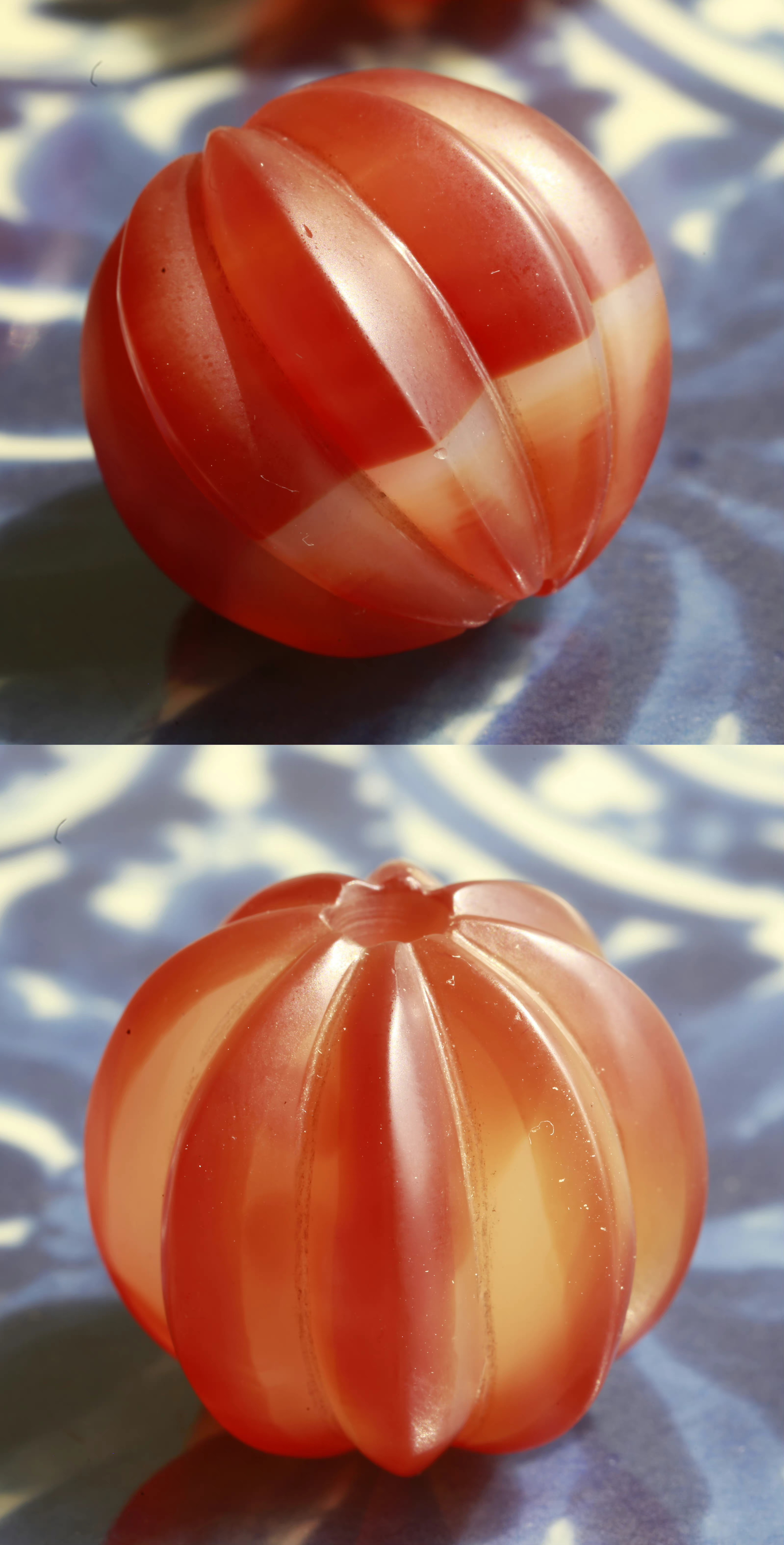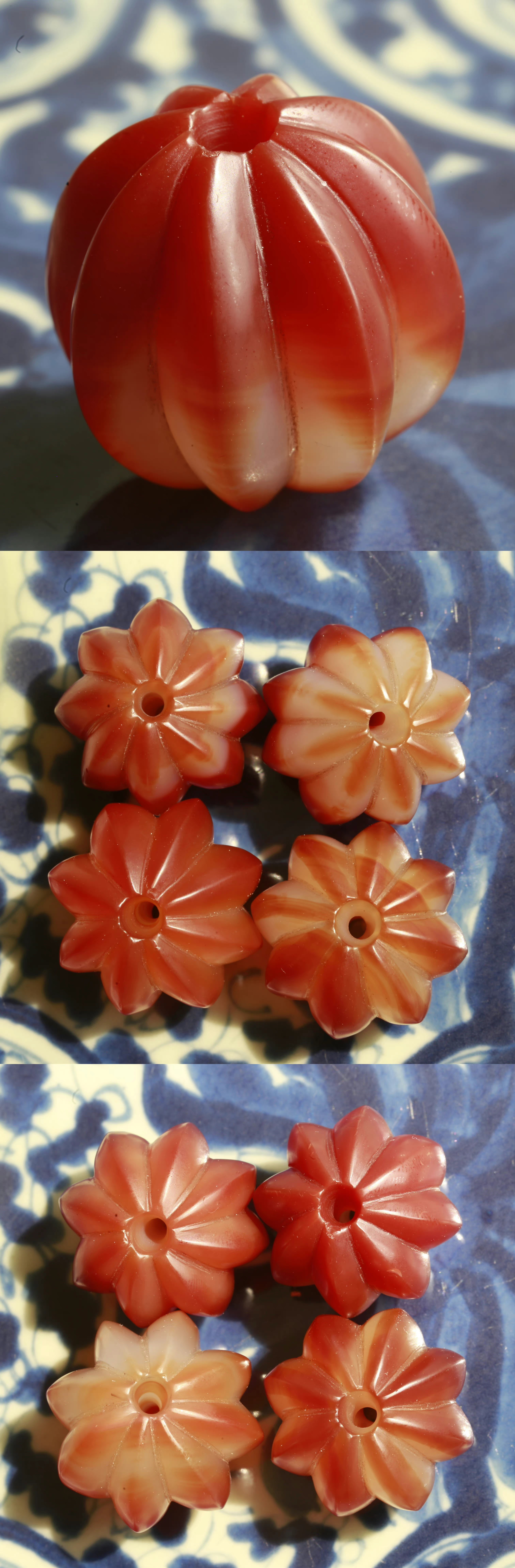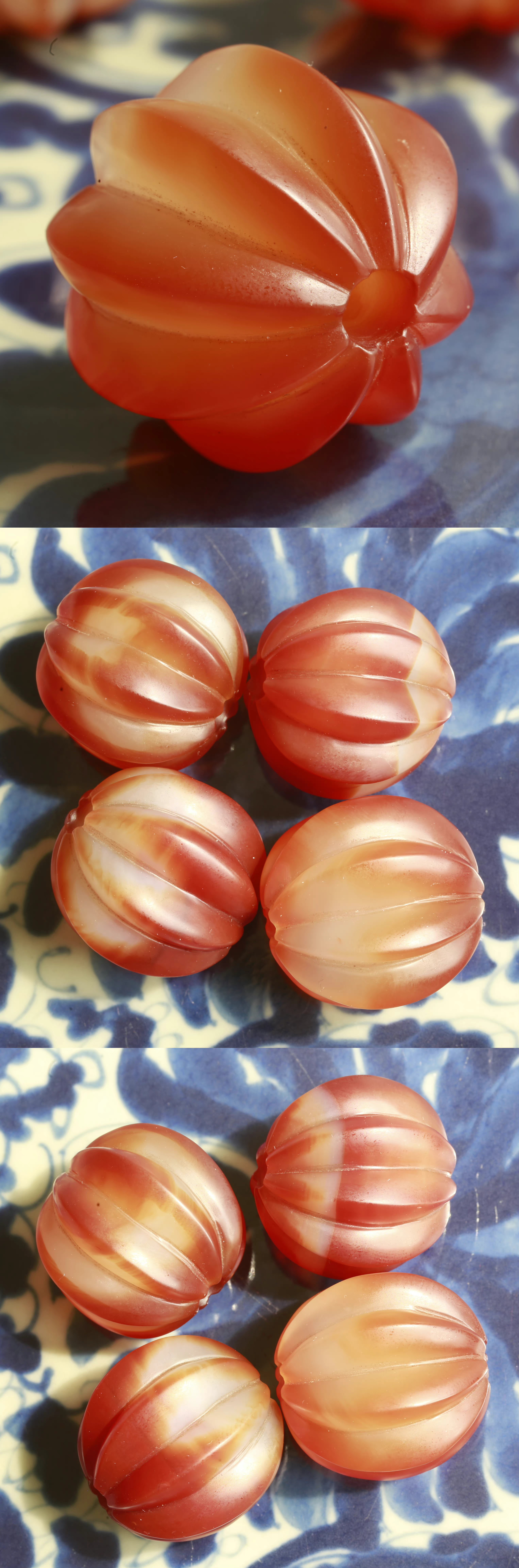 此玛瑙瓜棱雕刻工痕是老工,就是清代时期的传统琢玉工具慢慢一点点雕出来的,非常漂亮,珠大饱满,雕刻深峻,手工感明显,单株都可佩戴于胸前,每颗珠子都可给其他饰品珮珠。