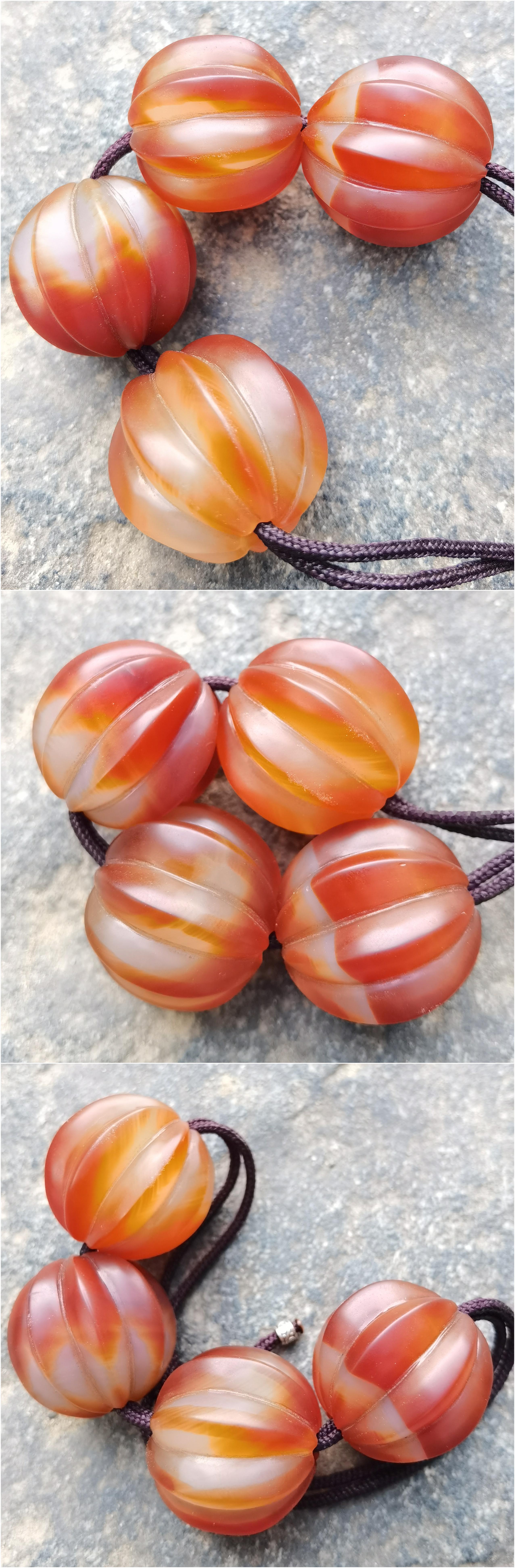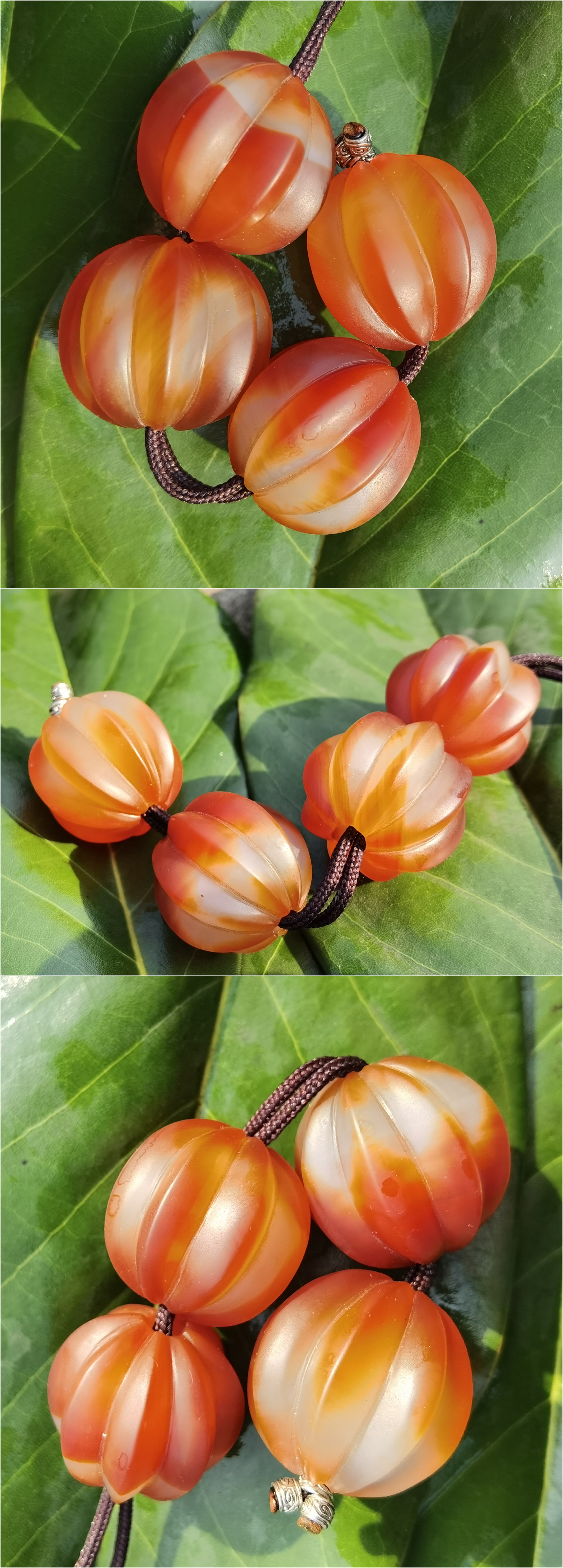 玛瑙质深红色夹乳白缟带等多种纹理。能见玛瑙天然纹理。粒粒直径仿佛,规矩有度,红公纯正,稳重可使人遥想,颗颗纯手工打磨瓜棱造型 质朴大气。玛瑙品质上乘,颜色淡雅,红润,晶莹剔透,光泽柔和。造型圆润,玛瑙材质细腻,色泽浑然天成。是一件可遇而不可求的珍品。需要国检证书者需另行付费,买家费用到位后立即做国检证书。届时证书和此四珠一本寄给你。