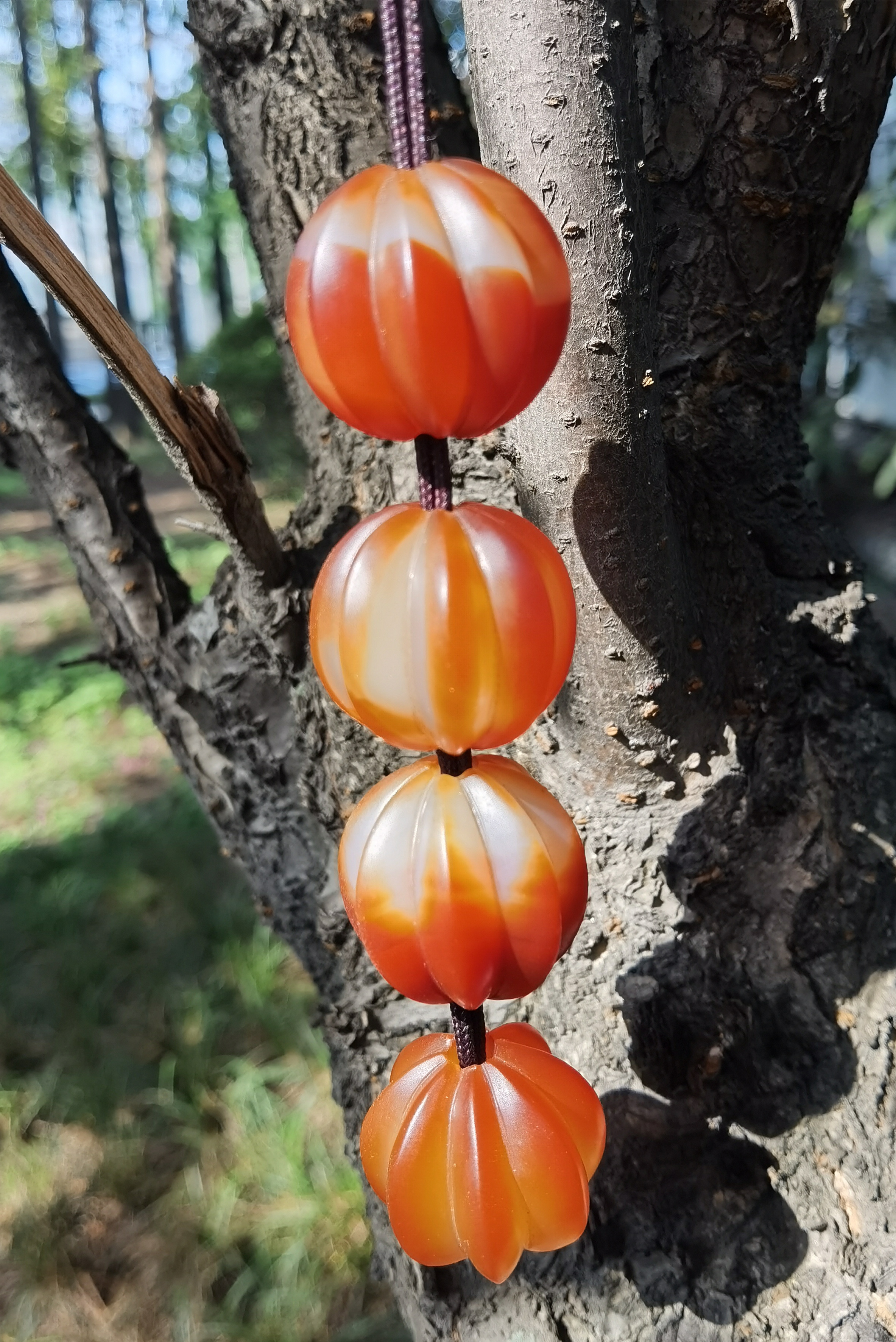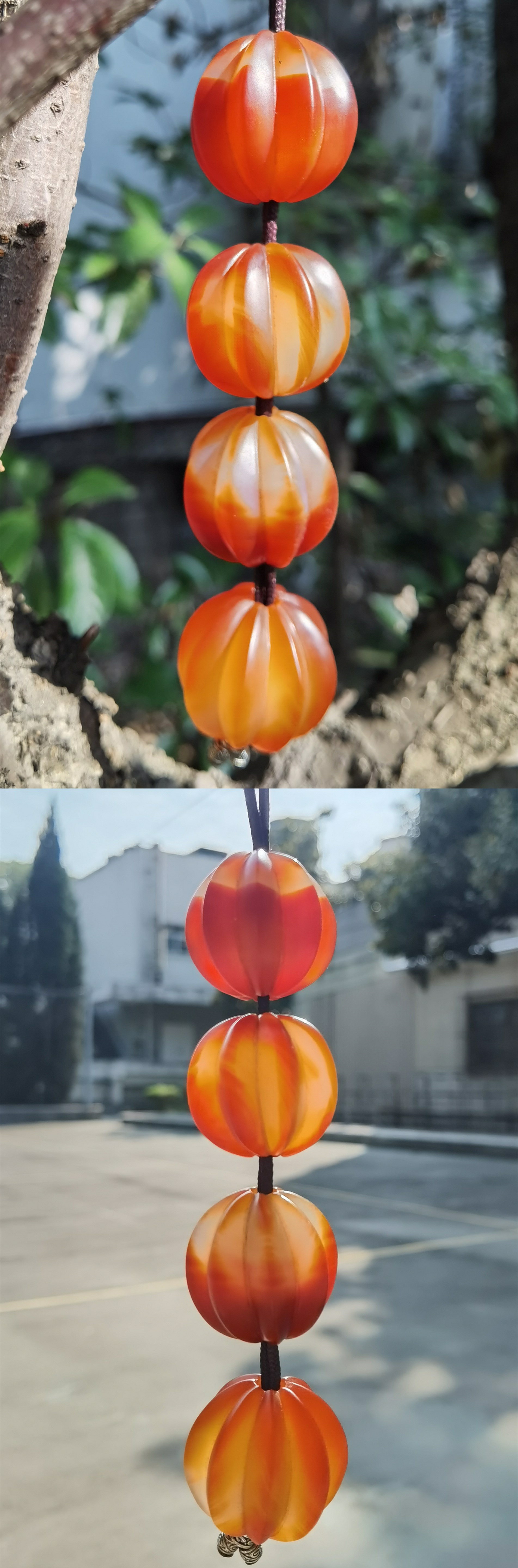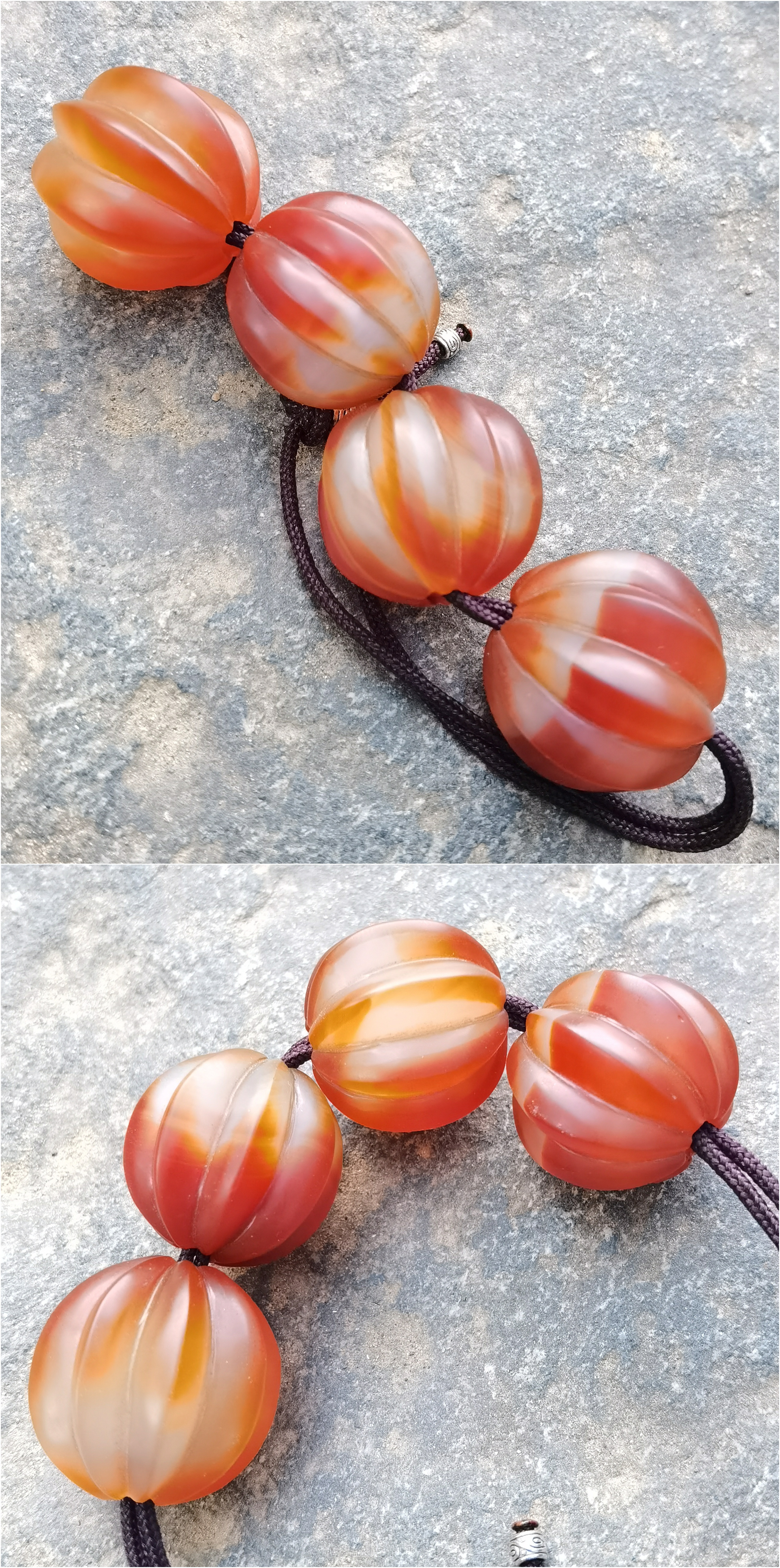 在当今,因为现代的烤色红玛瑙价格低廉,没有人去把价格低廉的烤色红玛瑙雕成瓜棱珠,即使用电动工具去雕,雕成这样太费事太费力太费工会赔本没有人去雕,谁会拿个不值钱的烤色优化红玛瑙雕成这样的形状呢?你会找块石头费劲费力费工用电动工具雕此形状吗?不会。这四颗珠子手工感明显,形状不同,棱棱不同,手工雕的是肯定是。无论是电动工具手工雕还是清代老工手工雕都是手工雕肯定,何况这珠子是清代老工手工雕珠子。