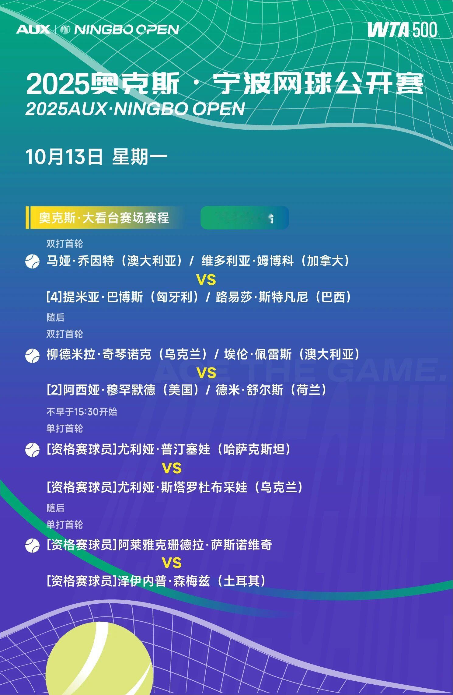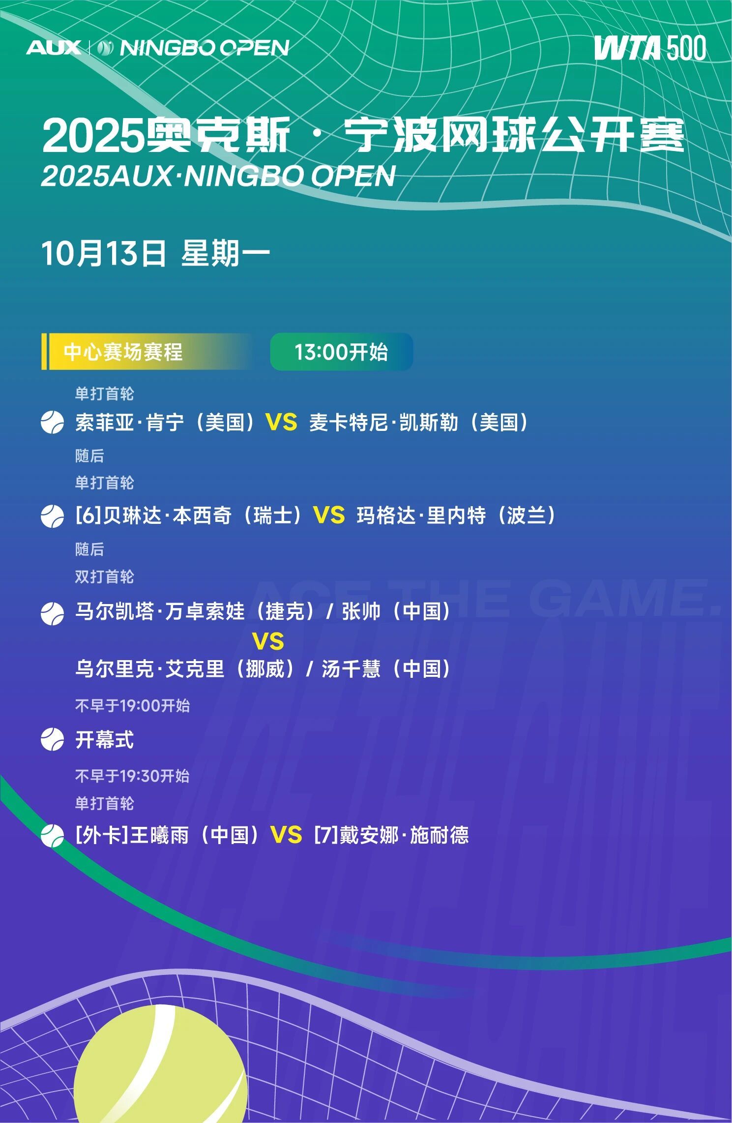 宁波网球公开赛今日赛程安排,所有比赛都从下午一点开始。