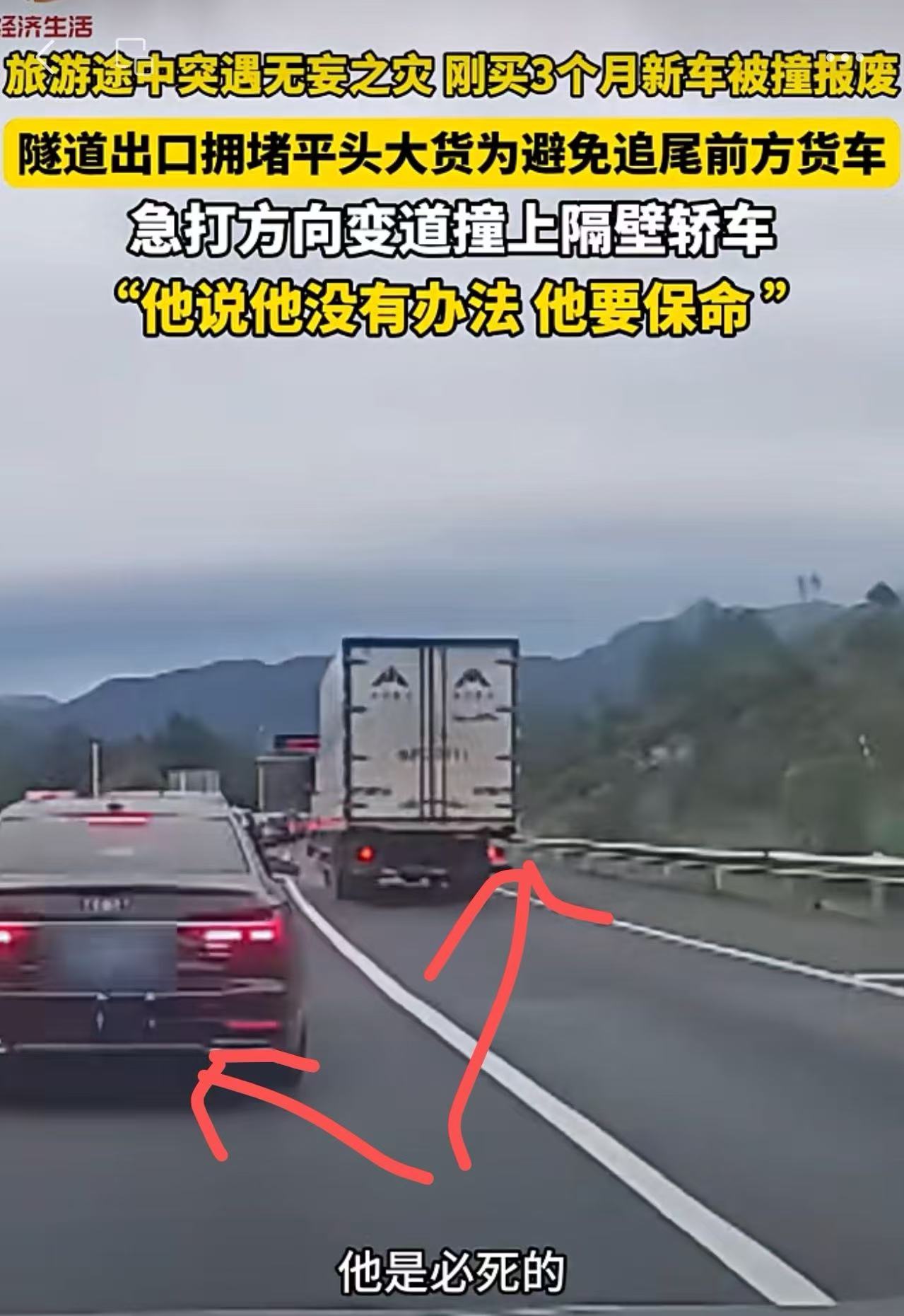 “选择性撞车!”湖南,男子刚买3个月的新车被大货车撞报废。而货车司机员表示:“我没有办法,刹不住了,我要保命,不变道就直接追尾前方大货车了”!男子:“你是保了命,但你有没有考虑过我们车上人的命?”