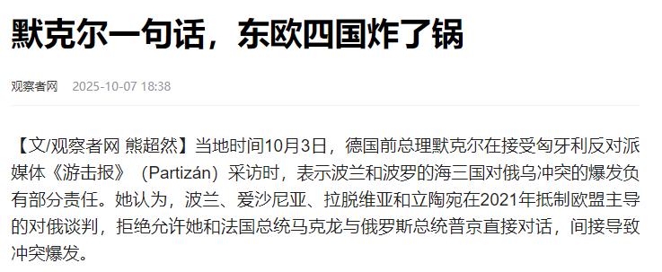 默克尔突然爆料,导致俄乌冲突大爆发的居然不是老美,而是波兰刻意火上浇油!最希望大毛与二毛两败俱伤的就是他们的邻居波兰! 据俄罗斯卫星通讯社10月6日消息,德国前总理默克尔在接受匈牙利媒体采访时透露,波兰是俄乌冲突爆发的推手之一。 这话一出来,很多人都愣住了,因为大家普遍认知是,美国是主要推手,拜登不断鼓励乌克兰对抗俄罗斯,各类援助物资也多打着美国标签,但默克尔的爆料像捅破了层窗户纸,再对照波兰这些年的操作,才发现这邻居的心思比想象中深多了。 默克尔可不是随口乱说,她在采访里说得很具体:2021年自己曾提议在欧盟和普京之间建对话机制,结果波兰联合波罗的海三国跳出来强烈反对,直接搅黄了这事。 要知道,那时候冲突还没爆发,正是能降温的关键节点,波兰这一拦,等于亲手掐断了外交缓冲的可能。 而波兰在冲突里的“投入”确实反常,按新华网的数据,光是援助就给了乌克兰40亿欧元,还培训了近3万名乌军士兵,更关键的是超过80%的对乌援助物资都要经波兰转运。 到了2025年,波兰的国防开支直接飙到GDP的4.7%,北约里排第一,还跟着特朗普喊要提升到5%,这劲头比美国本土还足,要知道北约规定才2%,波兰这么砸钱扩军,真只是为了“防御”?恐怕不尽然。 更耐人寻味的是波兰的地缘操作,它一直喊着“今天的基辅就是明天的华沙”,把乌克兰当成自家安全缓冲区,这种心态下,自然不希望俄乌停火,去年9月俄罗斯无人机进了波兰领空,本该谨慎处理的事,波兰直接启动北约磋商机制,还忙着跟法国谈核共享,借着这事往北约体系里抢话语权,前脚炒作完无人机事件,后脚就跟德国要二战赔款、批准北约长期驻军,一套组合拳下来,怎么看都像借冲突谋利。 还有美国那边刚有要甩手的迹象,波兰救立马接了棒,北约从美国手里接管波兰防空系统后,波兰直接成了对乌援助的物流枢纽,热舒夫市每天都有“看不到头的车队”往乌克兰运装备,甚至还有坦克往俄加里宁格勒方向开。 这积极性可比美国政府高多了,毕竟美国只是想削弱俄罗斯,波兰却巴不得俄乌两败俱伤——俄罗斯被拖垮,乌克兰成不了威胁,自己正好当中东欧的老大。 感觉为了这个目标,波兰现在连经济都豁出去了,比如单方面关闭与白俄罗斯边境,导致占中欧班列90%过境量的马拉舍维奇口岸停摆,国有铁路巨头两周就少赚一大笔,当地失业率飙升。 政府嘴上说代价必要,实则心里门清,只要俄乌打下去,自己就能靠北约东方哨兵的身份持续吸血,这点损失算什么,这种损人利己的算计,比美国的霸权操作更露骨。 说到底,波兰的底气还是来自历史创伤,沙俄和苏联留下的阴影太深,让它一门心思要搞垮俄罗斯,哪怕把欧洲拖进危机也不管,但它忘了,智能战争里导弹可不长眼,去年9月波兰驻乌大使馆被俄军空袭,已经是个警告,真要是哪天擦枪走火,北约的集体防御承诺未必能及时生效,最先遭殃的还是波兰自己。 现在再看默克尔的爆料,与其说是“突然”,不如说是彻底看透了,波兰这些年借着冲突刷存在感、扩势力,早已不是秘密,只是大家被美国的光环遮了眼,可等俄乌真的两败俱伤,波兰未必能笑到最后——现在周边国家谁不清楚它的野心?到时候众叛亲离,恐怕又是一场新的麻烦。