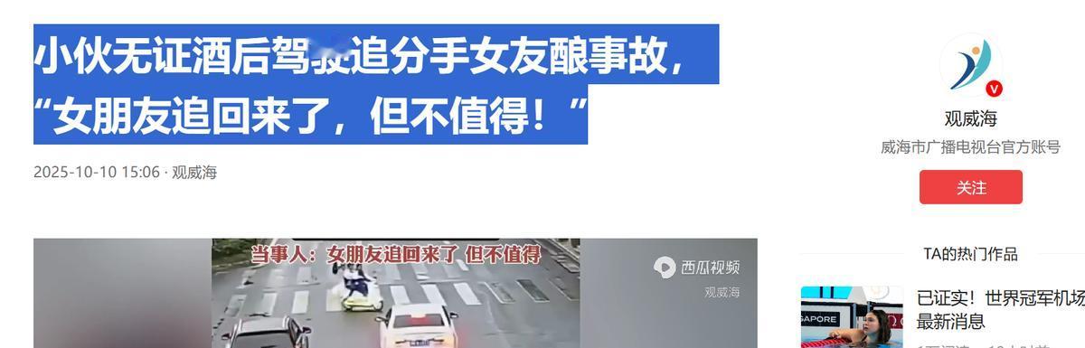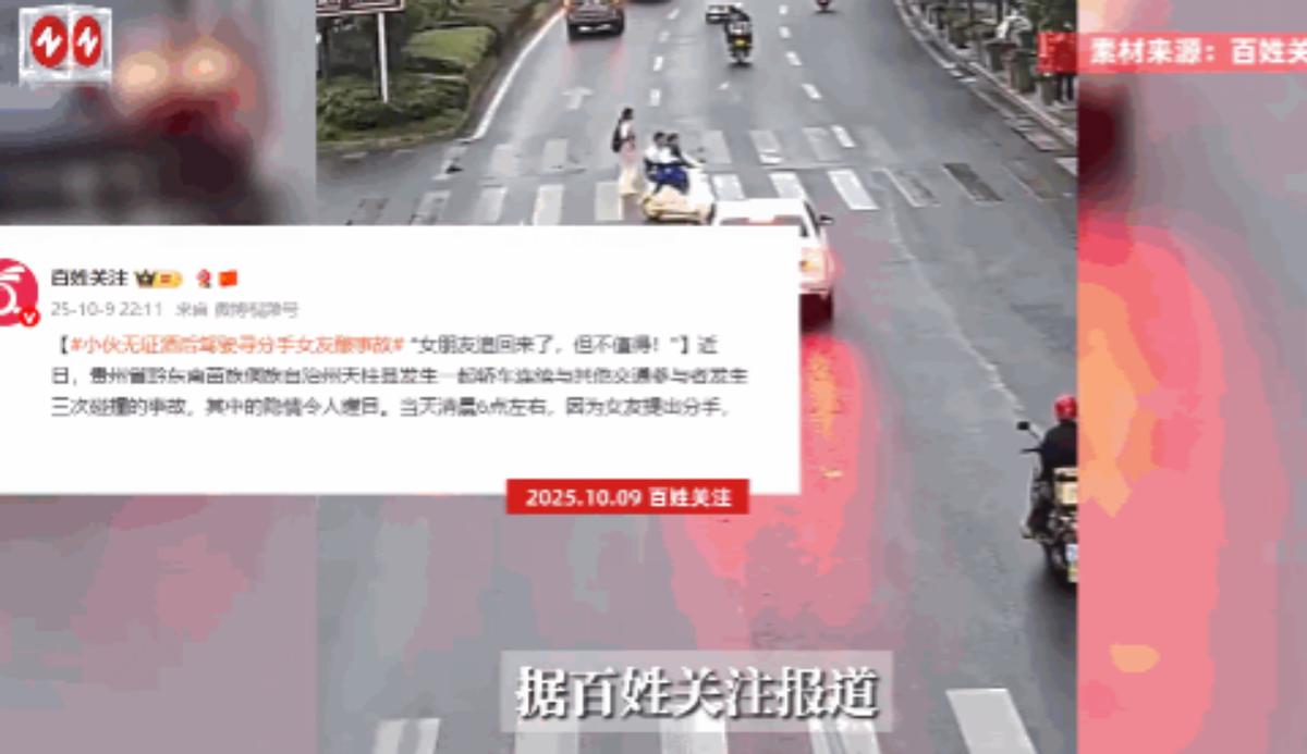 “必须严惩!”近日,贵州黔东南,一19岁小伙因为和女朋友吵架,对方提出了分手,他一着急竟然不顾自己没有驾驶证还喝了酒,直接在清晨6点开车上路,结果撞倒了一位行人、两个骑电动车的路人以及剐蹭一辆轿车!网友:为了女友连命都不要了吗。 前阵子刷到贵州黔东南的事儿,看完真是又气又急,19 岁的小伙子,就因为跟女朋友吵了架,对方提了分手,居然能干出那种糊涂事,说真的,这事儿必须严惩! 事情就发生在最近的一个清晨,天刚蒙蒙亮,才 6 点多,街上还有不少早起赶路的人,这小伙子前一晚刚跟女朋友闹了矛盾,俩人吵得挺厉害,他还喝了不少酒,估计酒劲都没完全过去。 结果一大早手机响了,打开一看是女朋友发的分手信息,他一下就慌了神,满脑子都是 “得赶紧见到她”“得把她劝回来”,什么规矩、什么危险,全抛到后脑勺去了。 他根本没琢磨自己连驾驶证都没考下来,更忘了前一晚喝的酒还在身体里没代谢掉,转身就找了辆车,发动了就往女朋友那边赶,一路上他心里又急又乱,眼睛盯着前方,脑子里全是怎么跟女朋友解释,连路上的行人和车辆都没太在意。 到了天柱县一个十字路口,正是早高峰前的时段,有不少人趁着车少过马路,他当时一门心思赶时间,看到斑马线也没减速,反而想快点冲过去,结果 “嘭” 的一声闷响,车子直接撞上了一辆正在过斑马线的电动车,那骑电动车的人没防备,一下就被撞得连人带车倒在地上东西撒了一地。 这时候要是他赶紧停车,下来看看情况、报警求助,也不至于后面更糟,可他当时彻底慌了,手忙脚乱地打方向盘,车子一下就失控了,又朝着旁边冲了过去。 刚好有个路人正步行路过,躲闪不及被车子撞倒,紧接着,慌乱中他的车又蹭到了旁边车道一辆正常行驶的奔驰车,奔驰车的车身被刮出了一道长长的痕迹,车主也赶紧停了车,下来一看这场景都懵了。 等周围的人反应过来,赶紧围过来帮忙,有人打了 120,也有人报了警,被撞的那三个人,两个骑电动车的、一个步行的,都受了伤,有的胳膊擦破了,有的腿被撞得动不了,疼得直皱眉,他们本来就是早起赶去上班或者办事的普通人,谁能想到好端端走在路上,会遇上这种飞来横祸? 后来警察很快到了现场,一查才知道,这小伙子不仅没驾照,血液里的酒精含量还超标,属于酒后无证驾驶,面对警察的询问,他才慢慢冷静下来,说自己是因为女朋友提了分手,太着急见她才犯了错,可再后悔也没用该承担的后果一点都少不了。 这事儿发到网上后,网友们也炸了锅,好多人都在评论里说 “为了个女朋友连命都不要了吗?”“自己想死别拉着别人啊!”“没驾照还喝酒开车,这不是害人害己吗?” 大家的气愤不是没道理的,他一时的冲动,不仅让自己要面临法律的制裁,更让三个无辜的人受了伤,打乱了他们原本的生活,甚至可能留下心理阴影。 19 岁,虽然年纪不大,但也该明白 “无证驾驶”“酒后开车” 是多大的错,更该知道不能拿别人的安全当儿戏,他为了挽回一段感情,就把法律和他人的生命安全抛在脑后,这种行为要是不严惩,怎么给被撞的受害者一个交代?怎么让其他年轻人记住这个教训? 现在被撞的三个人还在医院接受治疗,后续的医药费、修车费都得这小伙子承担,更重要的是,酒后无证驾驶是严重的违法行为,等待他的肯定是法律的严惩,罚款、拘留,说不定还会留下案底,这对他以后的人生都会有影响。 感情里有矛盾很正常,哪怕是分手也有无数种理智的解决办法,打个车过去好好说,或者等双方冷静下来再沟通,怎么都比无证酒驾强,他偏偏选了最极端、最不负责任的方式,既毁了自己,也害了别人。 (信息来源:观威海——小伙无证酒后驾驶追分手女友酿事故, “女朋友追回来了,但不值得!”)