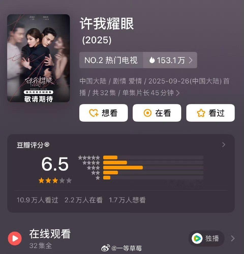 赵露思、陈伟霆《许我耀眼》豆瓣开分6.5
