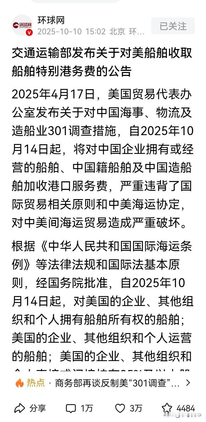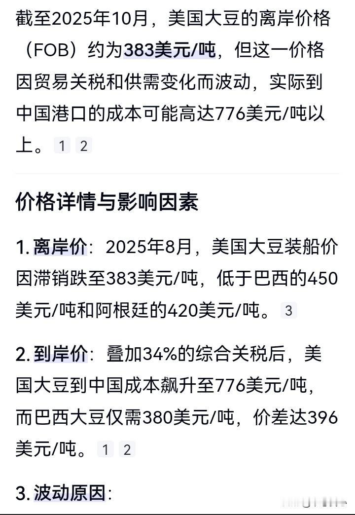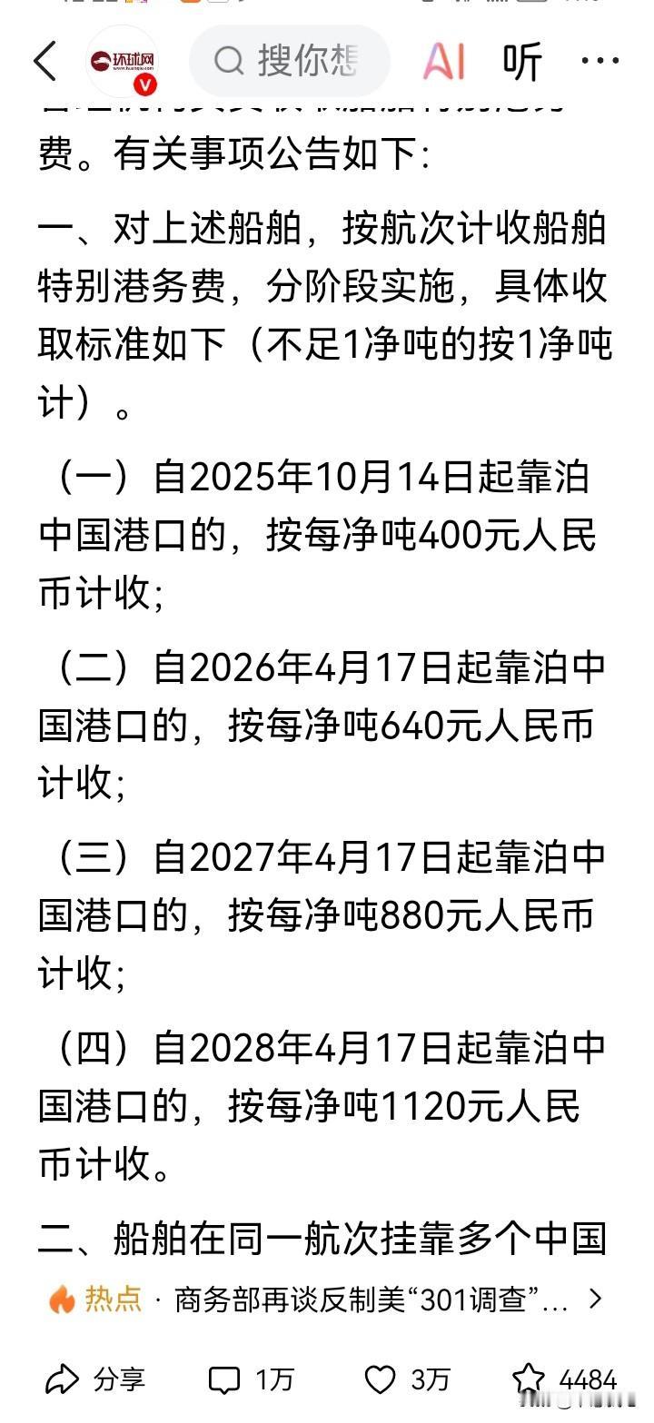 美国一方面抱怨中国没有买大豆,另一方面又要收港口服务费,一吨大豆才多少钱,假如随便就收400-1120元,能有钱赚?我们还是买巴西、阿根廷的好了。 周五的时候,忽然看到消息,简单说,就是我们要对美国的船舶收一个什么特别港务费?这是为何?我们中国一向不会挑事情的啊。 仔细一看,果然,还是美国动手在先,我们跟着出一个对等措施而已。而且,这是美方在4月17日就公布的,要在10月14日起,对我们的船舶加收所谓的“港口服务费”。对别的国家地区都没有这个收费,就针对我们中国,明摆的歧视、打压行为! 从4月17日公布,到现在快半年过去,期间,我们和美方也有接触磋商,这个“港口服务费”肯定也会谈及吧,却一直没有取消,马上就要执行了 那我们也只有出台对等措施。 如果看回我们给出的收费标准,估计和美方对我方的收费差不多,不多也不会少,10月14日起,按每净吨400元人民币计收;以后2026年4月17日起,每净吨640元人民币计收;2027年4月17日起,每净吨880元人民币计收;2028年4月17日起,每净吨1120元人民币计收。 收费高,而且一直快速提升。假如是一吨的高科技产品,芯片、手机等等,你收400元,甚至1120元,对产品的货值也影响不大。 假如是一吨大豆呢,一吨大豆3-400美元,合计人民币也就是2、3000元,400元的“港口服务费”已超过10%,过几年1120元的收费,说不定要占到货值的接近一半! 大豆这东西,虽然你美国的原本价格可能比较低一点,或者说即使质量好一点,如果加上关税、“港口服务费”,成本涨到天上去了。那么再好,我们也吃不起、用不起吧。 何况这东西,不是独门生意,而是买家市场,不和你美国买,巴西、阿根廷的大豆生产商很欢迎我中国啊! 所以啊,美方一直抱怨说我们中国有多久没有和他们买过一粒大豆了,好像说是有半年左右,其实,问题源自他们自己,这个还不是太清楚了嘛!美国大豆出口 书慰我心说国际时政