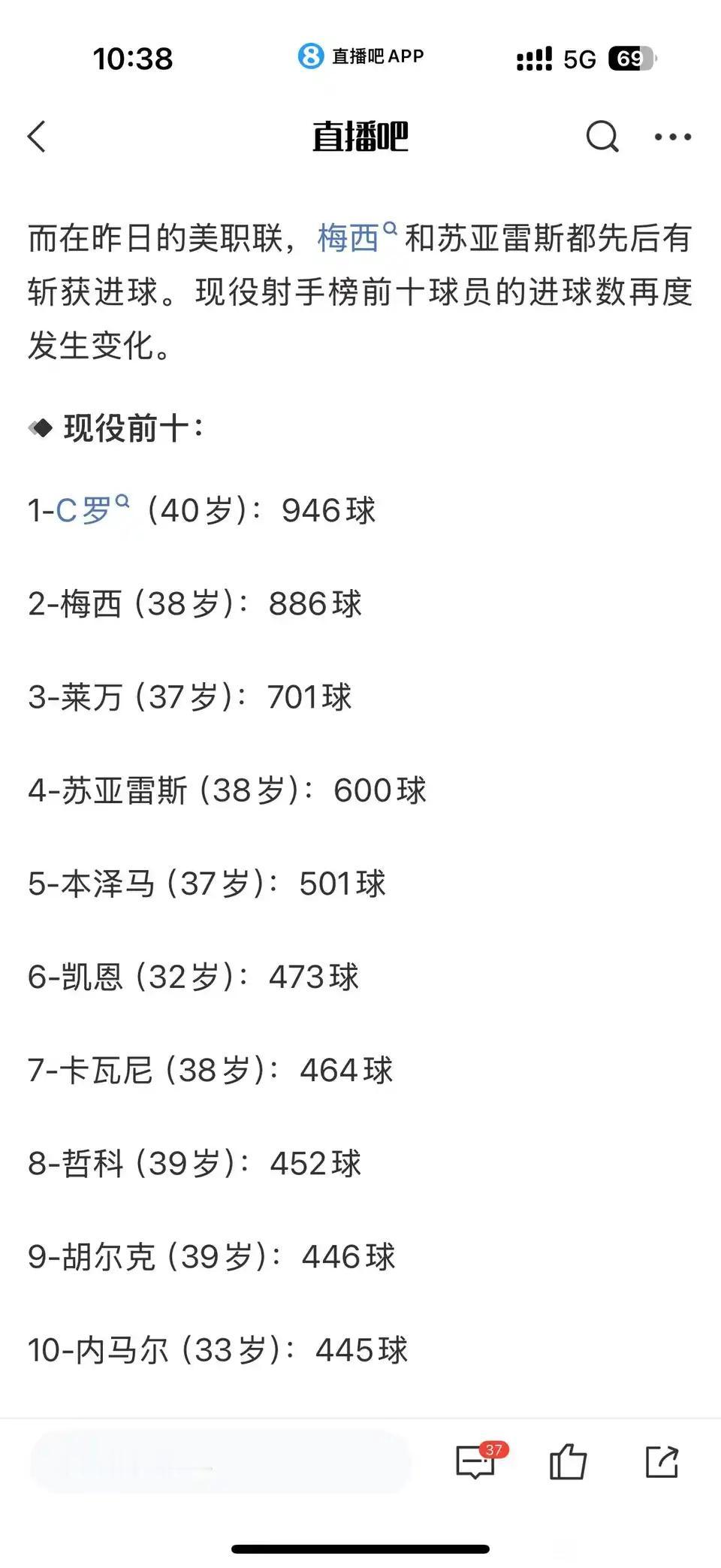 现役十大射手进球数更新。 C罗946球,距离他的1000球目标不远了。 梅西886球,应该追不上罗球王了。 莱万701球,巴萨昨天明确表示不续约,但是去其他队还能刷一刷。 苏亚雷斯600球,差不多啦。 本泽马501球,在沙特刷进球。 凯恩473球,在顶级联赛刷进球。 能上榜的都是超级巨星,只有胡尔克曾经是中超球员,他也蛮能刷的。[呲牙]