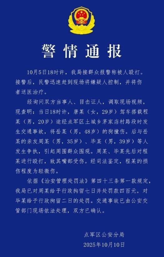 狗不拴绳还有理了!10月5日,湖北宜昌,一女子晚上开车时,撞到了一条横穿马路的狗,女子和朋友急忙下车查看情况,不料,对方过来后直接一拳打到朋友的太阳穴上,随后多人上来围殴,造成朋友嘴巴撕裂,缝了20多针! 10月5日晚上,湖北宜昌的唐女士和朋友驾车出行时,遇到对向车辆开启远光灯,导致她短暂失明,就在视线恢复的瞬间,一条未拴绳的狗突然横穿马路,唐女士来不及刹车将狗撞飞。 事故发生后唐女士立即停车,和朋友一起下车查看情况,但是狗主人岳某和家人赶到现场后,情况急转直下,岳某的亲友周某和比某二话不说,直接朝唐女士朋友程某进行了殴打。 唐女士的朋友试图用手机记录现场情况,手机却被对方抢夺,混乱中唐女士朋友的嘴部严重撕裂,随后唐女士报了警,警方来到后制止了这场殴打,并将唐女士的朋友程某送到医院治疗,送医后程某嘴部缝合了20多针。 经过公安机关调查取证,依法对周某和毕某进行了行政处罚,依据《治安管理处罚法》第四十三条第一款规定,对周某给予行政拘留七日并处罚款四百元,对毕某给予行政拘留二日的处罚,交通事故已由公安交管部门现场依法处理。 这起事件暴露出多个问题,夜间行车安全问题,乡村道路照明条件普遍较差,加上对向车辆使用远光灯,极易造成驾驶员短暂失明,远光灯在150米内会让对向驾驶员完全看不清路况,这种光污染每年造成大量交通事故。 再就是养犬管理问题,根据《动物防疫法》和各地养犬管理条例,携犬外出必须使用牵引绳,宜昌市相关规定明确要求,犬只在公共场所必须由成年人牵领,牵引绳长度不得超过2米,狗主人放任犬只在公路上自由活动,明显违反了相关规定。 对于养犬人来说,使用牵引绳不仅是法律要求,更是对宠物负责的表现,据统计,每年因未拴绳导致的宠物交通事故数以万计,其中大部分本可以避免。 这起事件都给社会敲响了警钟,文明养犬、安全驾驶、理性处理纠纷,这些看似简单的要求,在现实中仍需要不断强化,法治社会不容许任何人以暴力方式解决问题,无论您对宠物有多深的感情,都不能成为伤害他人的理由。 麻烦看官老爷们右上角点击一下“关注”,既方便您进行讨论和分享,又能给您带来不一样的参与感,感谢您的支持!