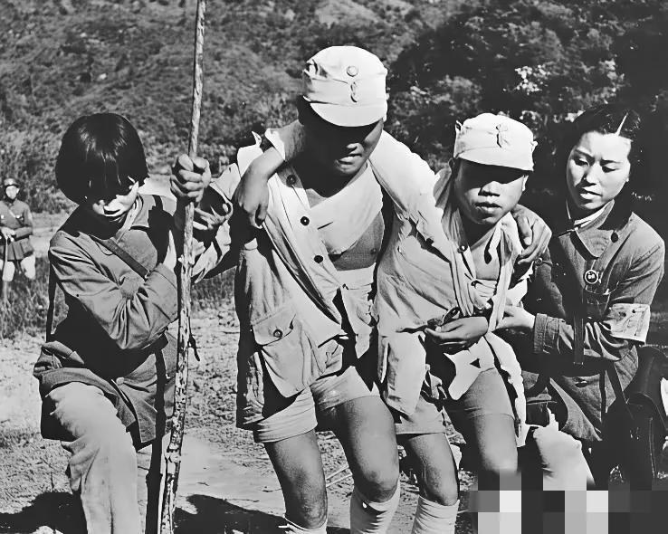 这是“长沙会战”期间的场景,受伤的士兵从前线被抬了下来。组织救助队的女生,大多是