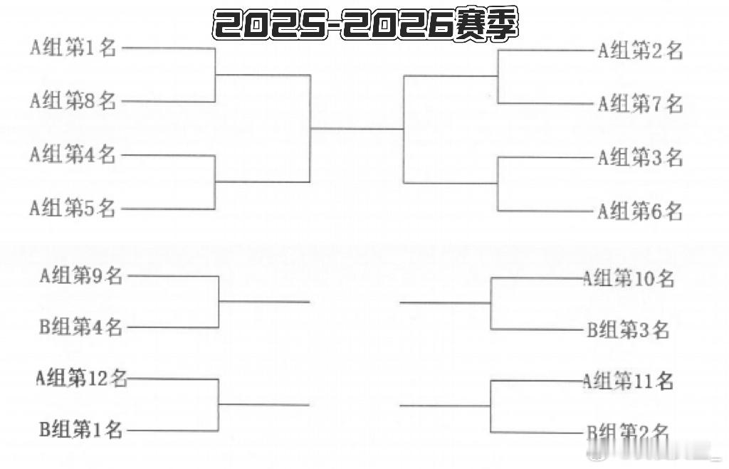 上赛季,季后赛阶段AB组打通,首轮16进8时,常规赛第1对第16,以此类推,因此哪怕常规赛排名列9-16名,也可下克上进入8强参加1/4决赛,江苏、新疆皆是如此进入8强。下赛季,A组前八直接锁定8强,不再与排名更靠后的球队交手,而A组9-12需要与B组1-4名进行排位赛,只不过排位赛赛制由3场2胜制(1-2)改变为5场3胜制(1-2-1-1),胜者进入未来一个赛季的A组。