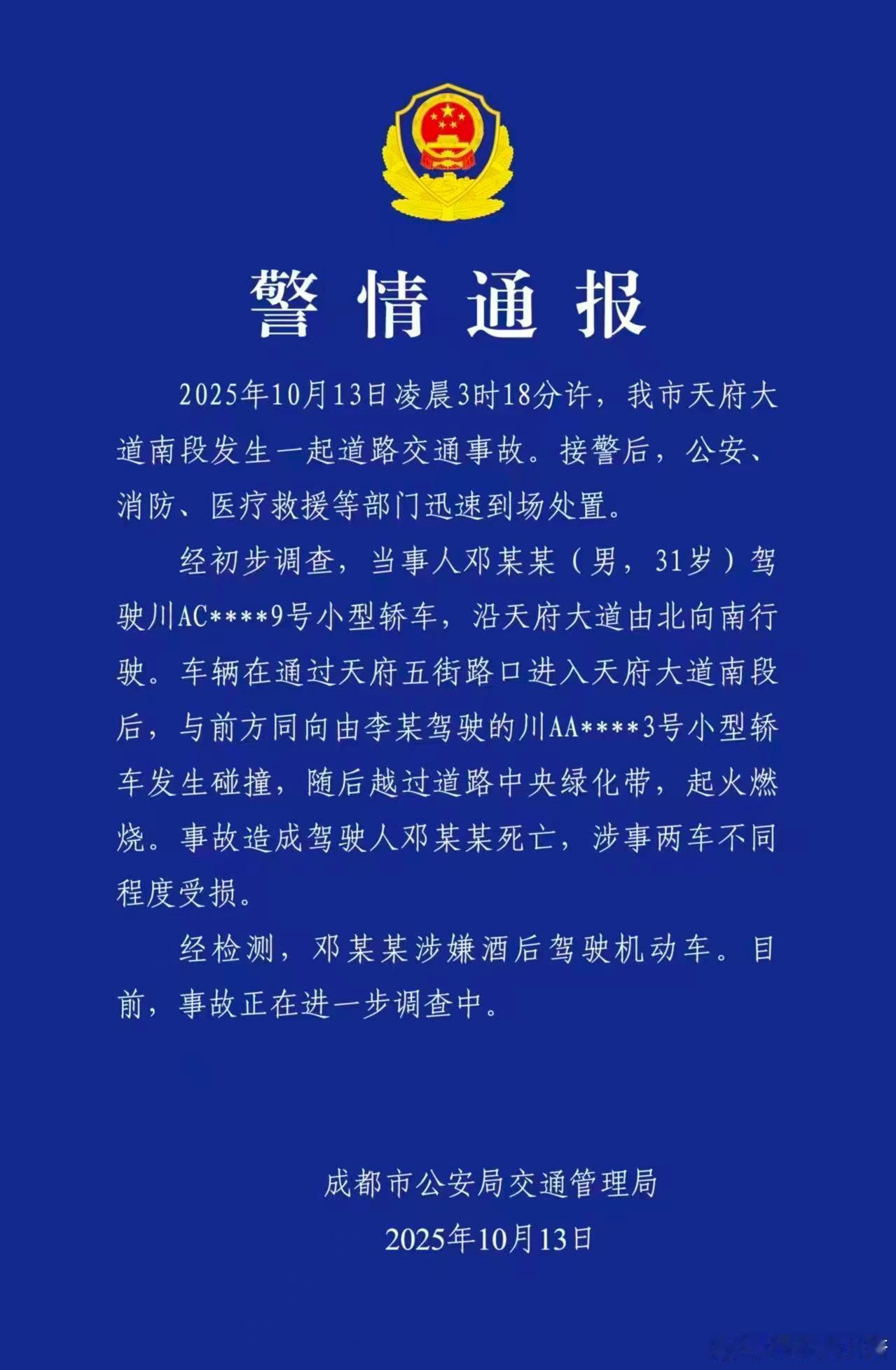 警方通报小米成都车祸 成都警方通报一车辆碰撞后起火大V聊车