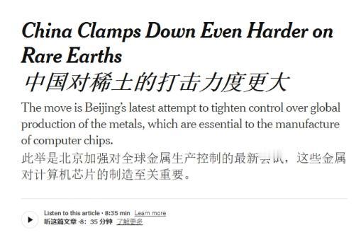 美媒:在中国严格的稀土管控措施下,美国可能买不到芯片 10日《纽约时报》分析认为,受中国的稀土物项出口管控政策影响,美国可能将无法买到先进芯片或相关产品,因为这些产品都含有中国稀土成分,比如英伟达生产的一款电容器,需要极难提纯的超纯镝制造,而全球的超纯镝都来自于无锡一家精炼厂。 这可不是小题大做,中国本来就占着全球稀土供应的九成,尤其是重稀土的加工环节,份额直接冲到了 99%。美国之前总想着摆脱依赖,可真到管控收紧的时候,才发现自己连替代品的影子都见不着。 特朗普政府之前还跟巴基斯坦签了稀土合作协议,投了 5 亿美元搞勘探加工,9 月刚热热闹闹签了字,10 月就从巴基斯坦发了不到两吨的货,里面有钕、镨这些元素,可这点量连塞牙缝都不够。 美国自己不是没有稀土矿,但压根没有像样的加工体系,想建起来不是一天两天的事。西方这些年也在加速本土稀土投资,可短期内根本补不上缺。现在全球稀土市场价都涨疯了,铕、铽这些重稀土价格直接翻倍,不少企业都在重新签合同,调整采购计划,就怕手里的原料断了供。 芯片产业对这些稀土元素的依赖早就刻进骨子里了,不止英伟达,其他做先进芯片的企业,哪款产品里没点中国稀土成分。 之前有人觉得能从澳大利亚、加拿大找矿源绕开管控,可就算找到了矿,最后还得运到中国来加工,提纯技术这关不是谁都能过的,无锡那家精炼厂的技术壁垒摆在那,短时间内没人能突破。 美国的国防承包商已经乱了套,订单延期一堆。美军自己的报告都承认,1900 多种武器系统都靠稀土,一架 F-35 战斗机就得用 420 公斤,一艘弗吉尼亚级核潜艇要 4 吨。 现在连芯片都要没了,军工供应链更别想稳。全球电动汽车普及率都超 30% 了,军工订单也在涨,这些领域都要抢稀土,美国的缺口只会越来越明显。 巴基斯坦那边的合作还引发了内部争议,伊姆兰・汗的政党要求公开协议细节,参议员还批陆军参谋长拿着矿石样本给特朗普看,像个推销员,说这伤了民主。 闹了半天,首批货就那么点,估计美国自己都觉得尴尬。这哪是找替代,分明是给自己找心理安慰。 中国也没把路堵死,6 月还加速审批了一批稀土出口,但管控的大框架摆在哪儿,不是你想要多少就能拿多少。西方一些企业开始琢磨回收技术,想从旧产品里提炼稀土绕过管控,可这技术还不成熟,产量更是有限,根本解决不了根本问题。 特朗普团队还在开会讨论对策,国会也想着拨款支持本土开发,可这些都是远水救不了近火。芯片生产卡在哪一步? 就卡在那点超纯镝上,无锡的精炼厂不给货,生产线就得停。之前美国总觉得能靠施压让中国松口,可现在才明白,稀土供应链的主动权压根不在自己手里。 巴基斯坦签协议的时候,总理和陆军参谋长都亲自出席了,还特意给特朗普展示了稀土矿石样本,想着靠这单生意缓解 1300 亿美元的外债压力。 可他们自己也没加工能力,还得靠美国公司带技术进来,等真能稳定供货,不知道要等到猴年马月。美国想靠这填补中国管控后的缺口,简直是做梦。 现在西方企业才算看清现实,之前总觉得稀土是普通矿产,随时能找到替代,可真到了节骨眼上,才知道中国在这个领域的话语权有多硬。芯片这东西看着是高科技,核心还是得靠稀土这种基础资源撑着,而稀土的命脉,就攥在中国手里。 美国之前加关税、搞技术封锁,觉得能拿捏住产业链,现在稀土管控一来,才发现自己的短板有多明显。 没有中国的稀土,别说先进芯片,不少高端制造产业都得歇菜。那些喊着 “摆脱依赖” 的口号,在实打实的供应链面前,根本不堪一击。 全球矿产链都在跟着重塑,可重塑不是一朝一夕的事。中国的管控政策一出来,市场立刻有了反应,价格涨、订单乱,美国企业慌了神,政府也拿不出像样的对策。之前还想着靠巴基斯坦那点货撑场面,结果连零头都不够,这脸打得着实有点疼。 不过中国的管控也不是一刀切,该批的出口还在批,但主动权得自己握着。西方之前总觉得能靠规则压人,现在才明白,资源话语权比什么规则都管用。 美国想买芯片?先得有稀土;想要稀土?得看中国的管控政策。绕来绕去,还是绕不开这道坎。 那些之前鼓吹 “本土供应链” 的人,现在也没了声音。建一个稀土精炼厂,从选址到投产至少要五六年,等美国自己的厂子建起来,不知道多少芯片企业都撑不下去了。 巴基斯坦那点矿,连塞牙缝都不够,澳大利亚、加拿大的矿还得靠中国加工,说白了,美国现在就是无计可施。 全球稀土需求还在涨,电动汽车、军工产品的订单越来越多,中国的管控只会让稀土的战略价值更突出。 美国现在才着急,早干嘛去了?之前对中国的稀土产业要么忽视,要么打压,现在想自己搞,哪有那么容易。 这波管控算是给美国提了个醒,产业霸权不是光靠技术就行的,得有资源话语权撑着。而现在,这话语权不在美国手里。