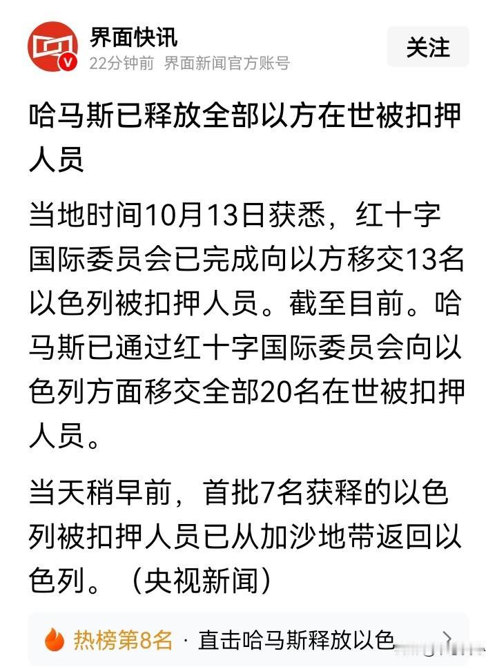 加沙停火,哈马斯扣押的20个人质也都释放了,能够幸存到获释,他们是幸运的。 9月初,当时公布出来的数据是,哈马斯手头有48名人质。但是,在以色列袭击哈马斯在卡塔尔多哈的高层后,卡塔尔方面发布的数据已经只有20名人质还生存着。 又过了这段时间,20名人质能一直存活,躲过饥饿、疾病,也可能包括来自以色列的炮火的袭击,在被哈马斯扣押长达2年后,最终迎来自由,这段曲折的人生历程,估计也会有人把它写成书,分享给世人吧。 哈马斯虽然是出于抵抗以色列侵略军的目的,而扣押了众多的人质。但是,普通老百姓是无辜的,哈马斯这样做,也遭到了全世界的谴责。希望以后不要再有这样的事情发生! 当然,最终是需要巴勒斯坦独立建国,巴勒斯坦和以色列两个国家之间的和解,让这片土地不再发生如此巨大的悲剧!