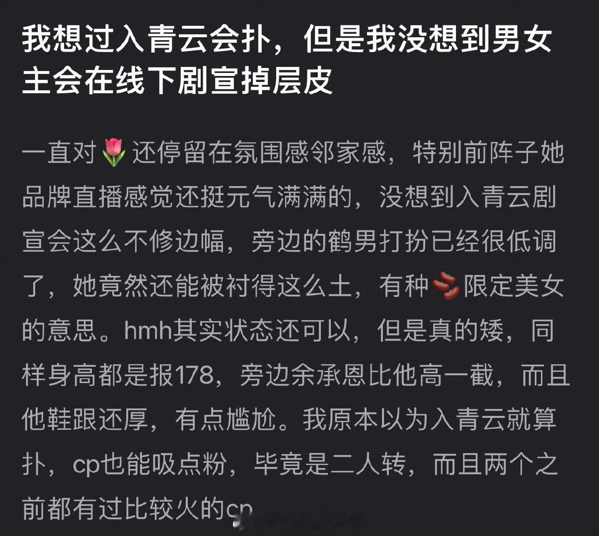 有网友说想过入青云会扑,但没想到男女主会在线下剧宣掉层皮,卢昱晓剧宣看起来不修边幅,旁边的鹤男打扮已经很低调了,她竟然还能被衬得这么土,有种🫘限定美女的意思,侯明昊状态还可以但真的矮,同样身高178,旁边余承恩比他高一截
