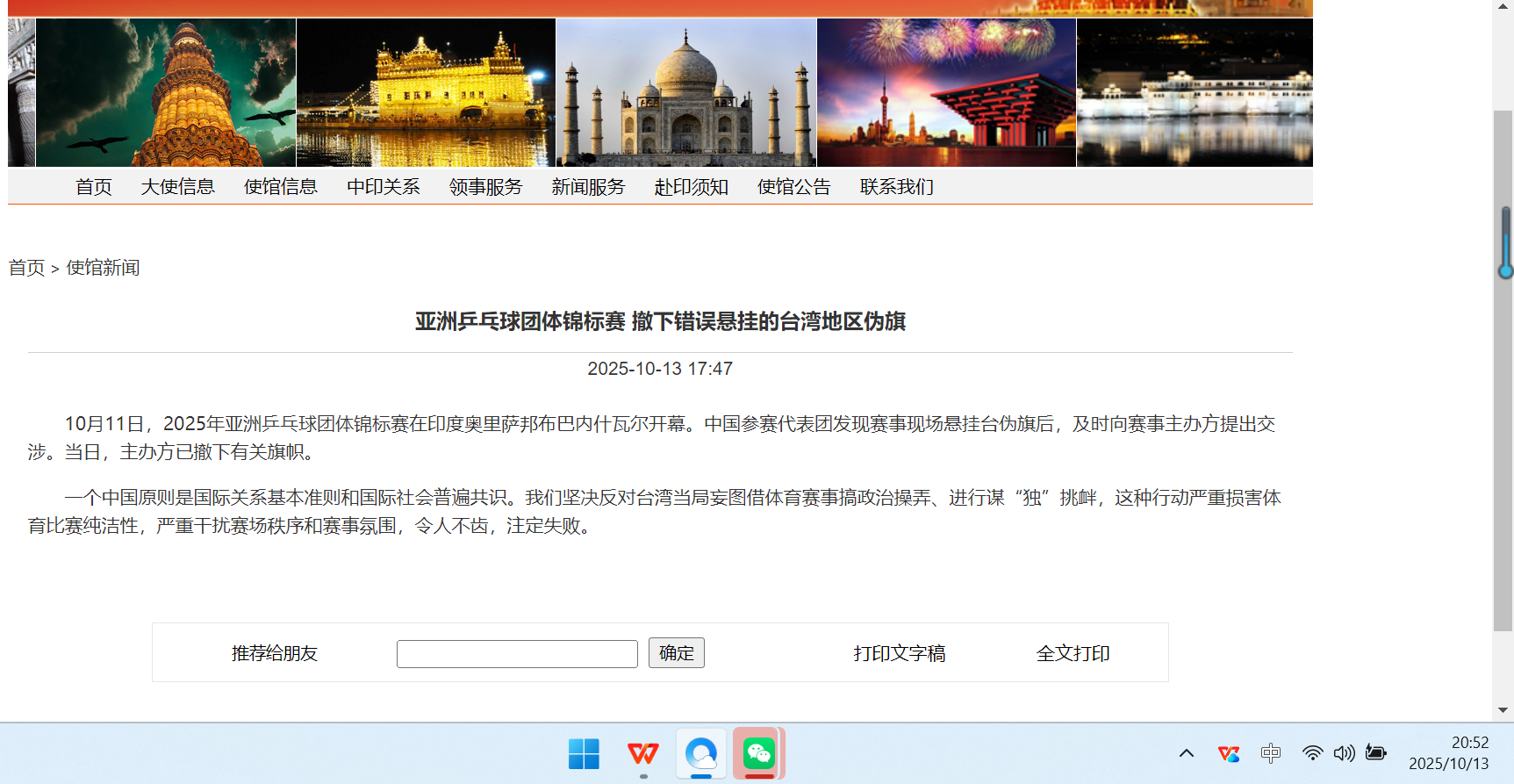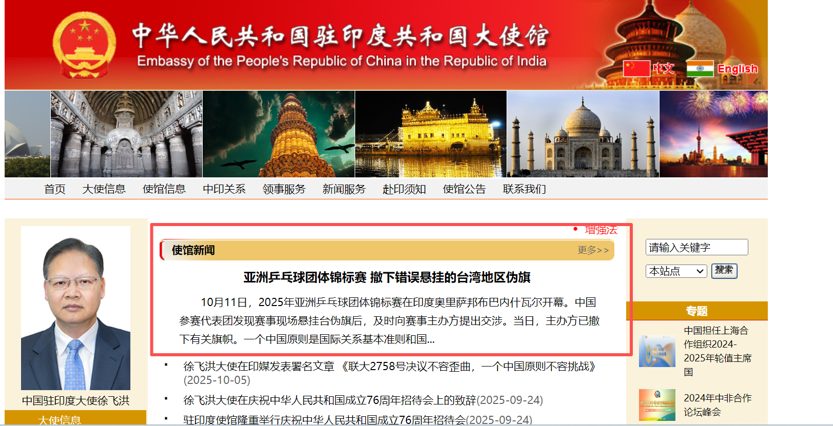 10月11日,2025年亚洲乒乓球团体锦标赛在印度奥里萨邦布巴内什瓦尔开幕。中国参赛代表团发现赛事现场悬挂台伪旗后,及时向赛事主办方提出交涉。当日,主办方已撤下有关旗帜。
