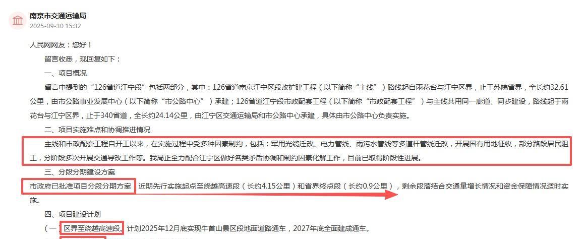 备受关注的126省道改扩建工程近日又有新进展,从人民网络问政和一些招标公告中可见端倪。 市政府已批准项目分段分期方案,近期先行实施区界至绕越高速段(长约4.15公里)和省界终点段(长约0.9公里)。区界至绕越高速段,计划2025年12月底实现牛首山景区段地面道路通车,2027年底全面建成通车。省界终点段,计划2025年12月底建成通车。剩余段落,将结合交通量增长情况和资金保障情况适时实施。 其中江宁区界至绕越高速段改扩建工程也属于机场二通道快速路的重要组成部分,目前机场二通道绕城以内路段即将全线通车,绕城至江宁区界段也在加速推进。未来机场二通道全部建成后,将大大改善南京主城西部与江宁和禄口空港之间的往来交通,缓解卡子门区域交通压力。 虽然从2019年,该道路工程就已经正式开工建设,但因各种原因,进展缓慢,让沿线人民群众苦盼多年。现在传来新动态推进消息,不得不说早日通车,有了眉目了!