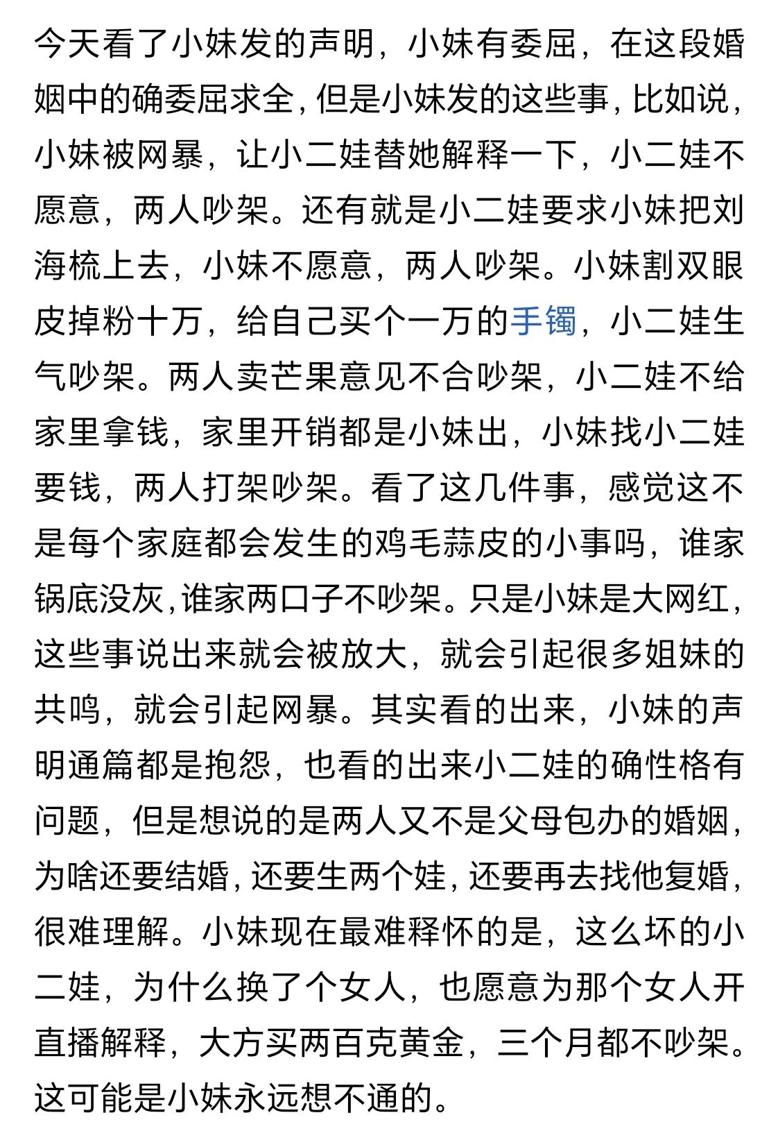从小妹儿不太理智的粉丝里看到对小妹儿吃瓜的解释,完全是站在女性的角度看问题,看得津津有味。头头是道说的全是前夫的不是与亏待。 小妹儿割了双眼皮,小二娃看着也不舒服,网友说就说嘛,又怪小二娃不和网友解释,解释什么?解释眼皮割得美吗? 剪头发的事情是她自己觉得不好叨叨叨,又说是二娃嫌弃她的刘海, 钱都在小妹儿自己手上,小二娃平时5000都没有,随手就买一万多的手饰,还说自己平时不舍得吃穿,哪餐小二娃亏待过,不都是大鱼大肉吗?衣服买不停。 小二娃重视后妻,有条件了买黄金,订婚买黄金很正常。 想不通小二娃为什么愿意给后面的女人花钱,想不通自己输在哪? 其实就是输在认知的不同上。 其实小二娃早就公布答案了,就是找个不吵架了,性子温和一点的,两个人都强势又怎么可能过得下去呢? 小妹儿应该知道小二娃的答案。因为小二娃无数遍谈过,别吵别吵,血压高了。 这些不理智的粉丝就把小妹儿捧上天。 [捂脸][捂脸][捂脸][捂脸][赞]小妹公开谈离婚 川乡小妹儿婚变