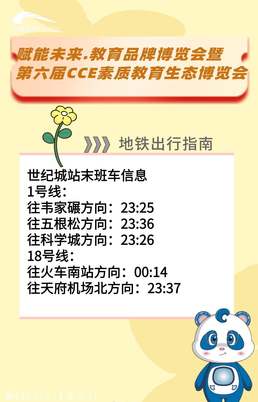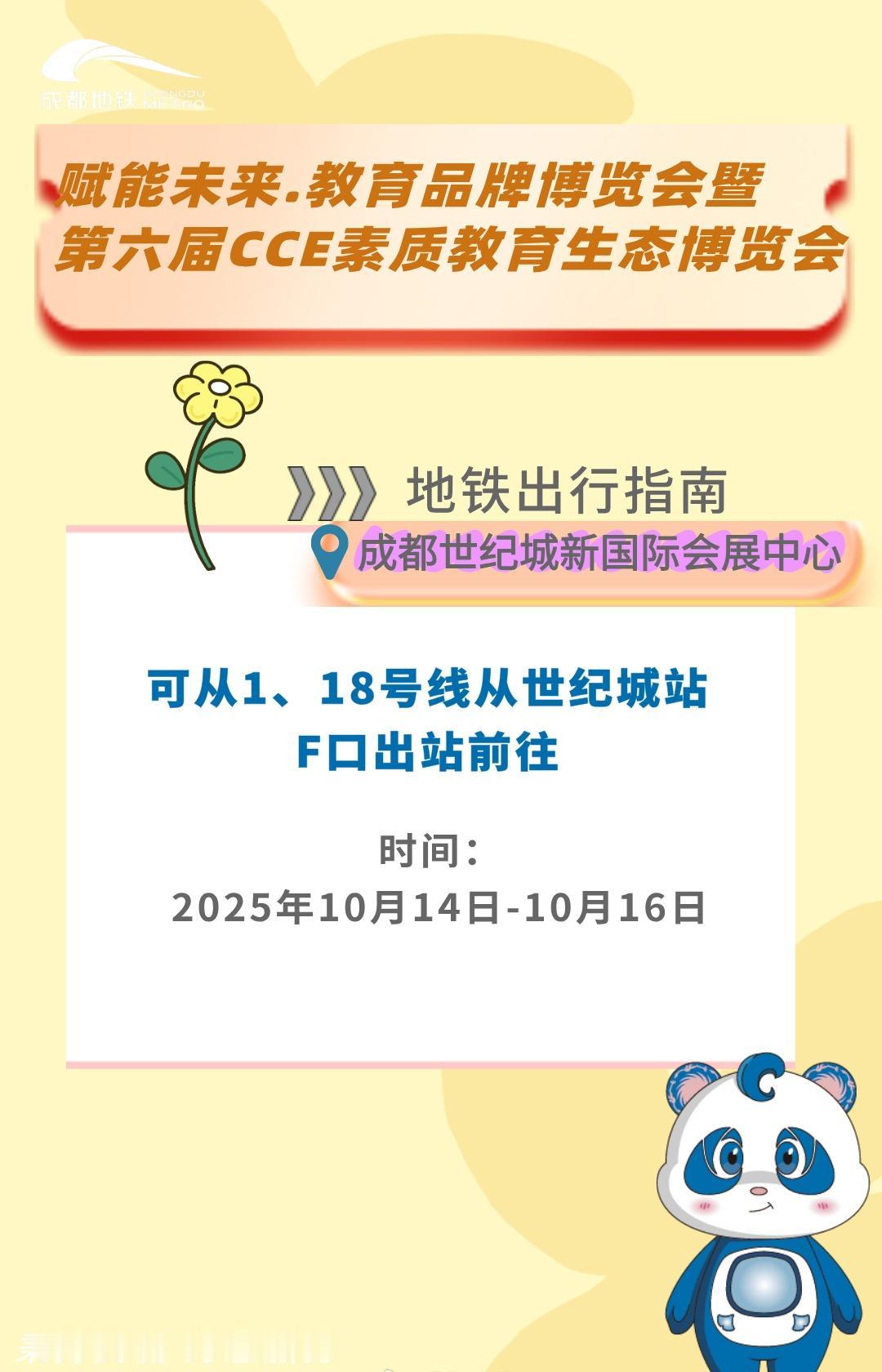 成都地铁出行提示10月14日-10月16日成都世纪城新国际会展中心将举办赋能未来.教育品牌博览会暨第六届CCE素质教育生态博览会。市民乘客可选择搭乘成都地铁1、18号线,从世纪城站F口出站步行约500米到达哦。展会结束后,请大家合理安排返程时间,搭乘地铁返程的乘客可从世纪城站F口进站乘车。