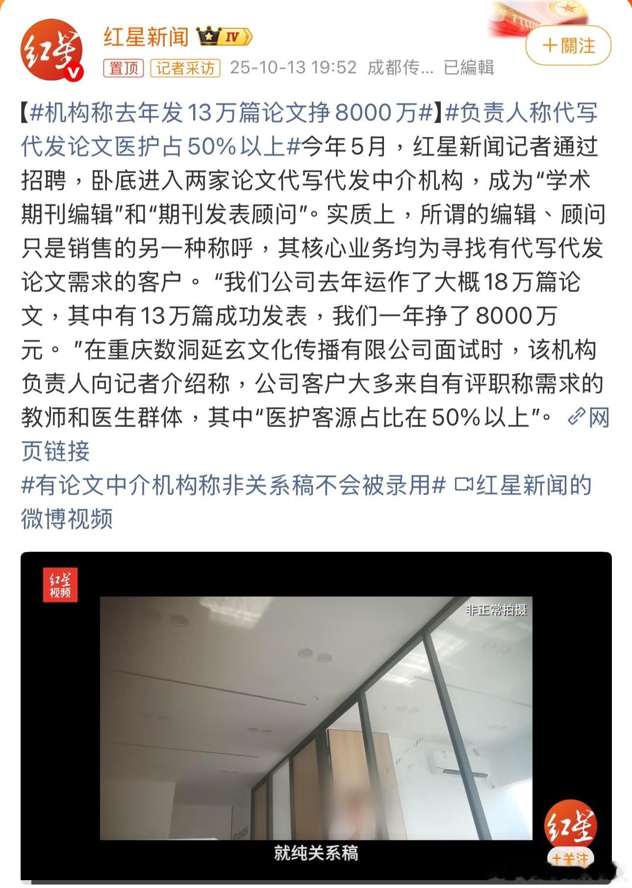 机构称去年发13万篇论文挣8000万 AI时代竟催生出这样的“灰色生意”?从选题、撰写到投稿“一条龙”,只求数量不管质量。这哪里是学术服务,分明是在批量制造学术垃圾!