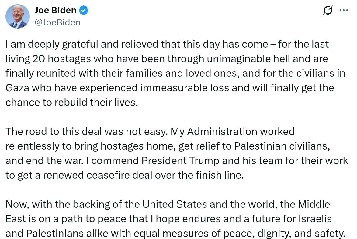 乔.拜登:我深深地感激和欣慰这一天的到来——对于最后20名人质来说,他们经历了难以想象的地狱般的折磨,终于可以与家人和亲人团聚;对于加沙平民来说,他们经历了无法估量的损失,终于有机会重建生活。 达成这项协议的道路并非坦途。我的政府不懈努力,将人质送回国,为巴勒斯坦平民提供救济,并结束战争。我赞扬特朗普总统及其团队为最终达成一项新的停火协议所做的努力。 现在,在美国和世界的支持下,中东正走上和平之路,我希望这条和平之路能够持久,以色列人和巴勒斯坦人都能拥有平等的和平、尊严和安全的未来。