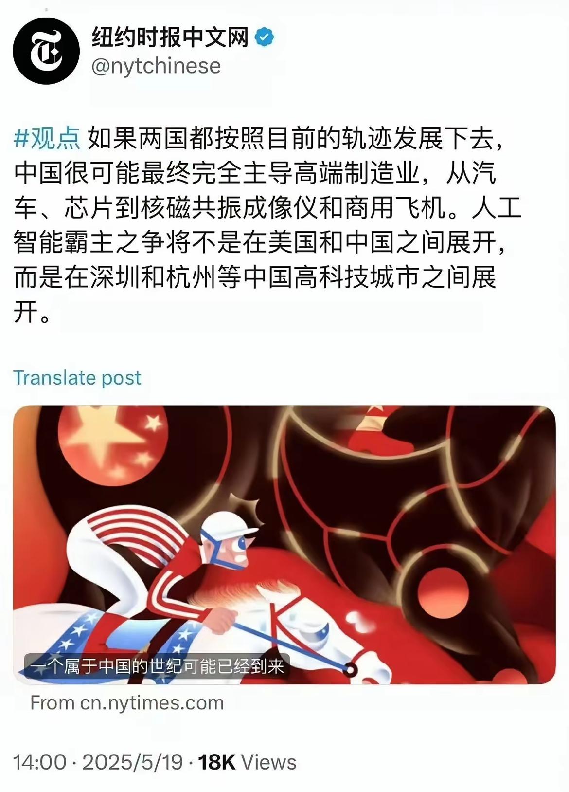 纽约时报观点称,如果两国都按照目前的轨迹发展下去,中国很可能最终完全主导高端制造业,人工智能霸主之争不再是在中美之间展开,而是在深圳和杭州城市之间展开。 纽时的观点不错,其实他们也意识到了这个问题,大面积的制裁中国的高科技企业,甚至采取连坐式的方式进行制裁,都是他们已经意识到这个问题做出的反应。 有网友评论:美国人不了解中国人的能力和性格,它越制裁反而越促进中国独立自主的能力,加速科技和制造业向高端转移。 这就像赛跑,看别人跑的快不是想着自己加油向前冲,而是处处给人下绊子,这思想就出了问题,国家竞争要守正出奇,靠邪门歪道不可能会确定最后的成功,为啥呐,因为人间正道是沧桑,美国如果不改变自己的做事风格,最后一定会一败涂地 对此,你怎么看?