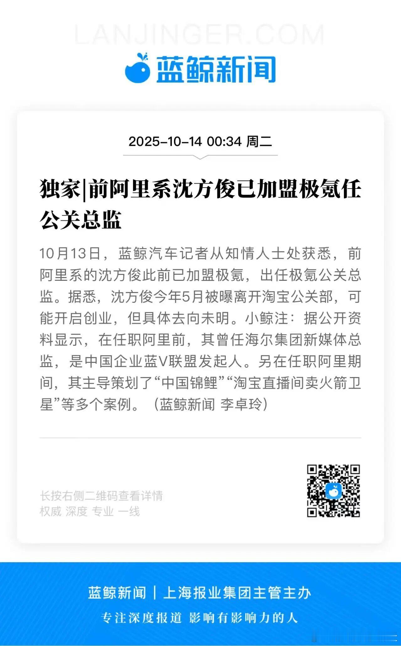 沈总之前在海尔和阿里都待过,有传统制造和互联网复合经验,期待能给极氪带来一些新的变化[揣手]