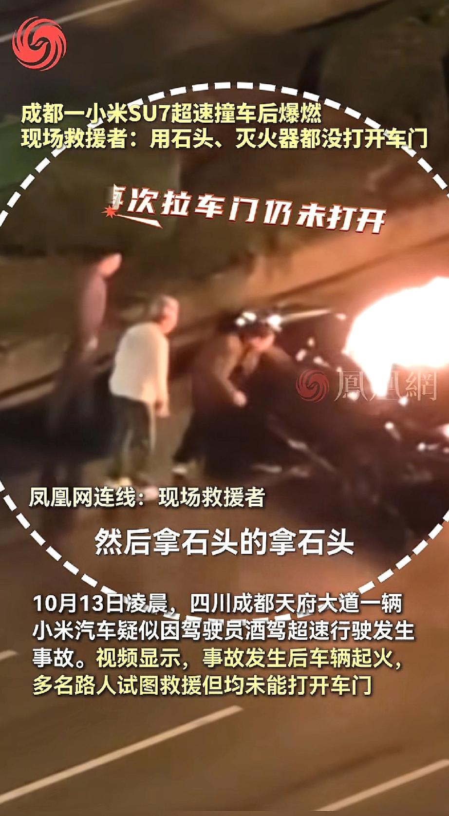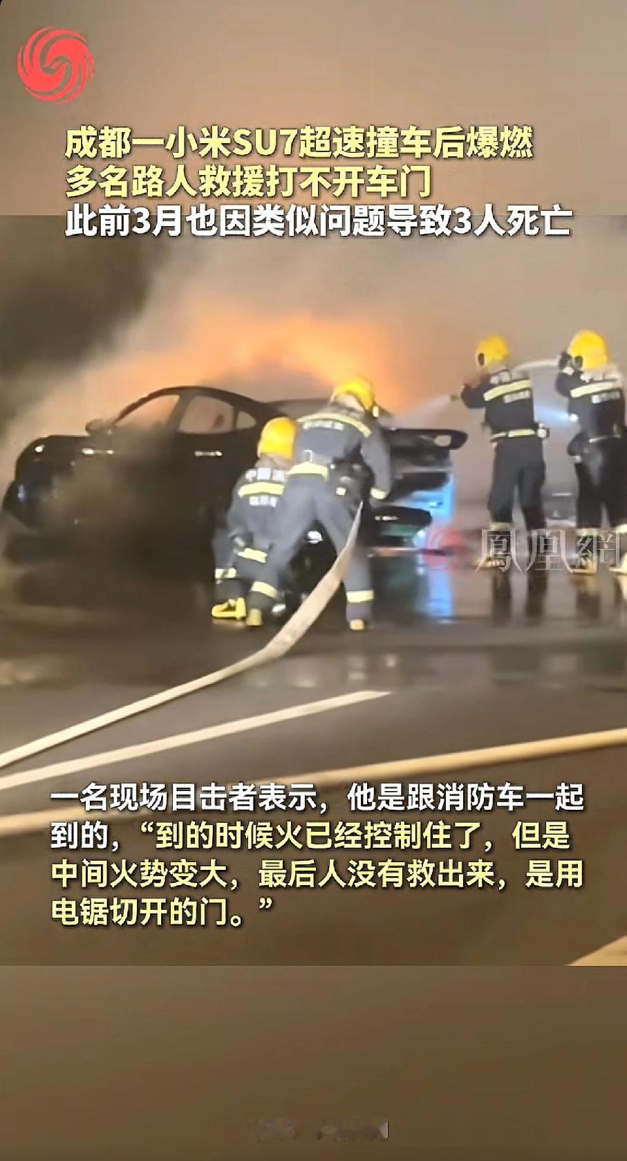 性能再牛,不如一扇能打开的车门!小米SU7事故该改改了,成都天府大道那场凌晨的火,真 能把人看揪心。路人拼了命拉门、用石头砸、拿灭火器撞, 手都流血了也没打开小米SU7的门,最后只能眼睁睁看着火势变大。 警方说司机涉嫌超速,但大家最堵心的还是那扇门。 这车有车内机械拉手,可藏在储物槽里,人要是撞懵了根本摸不到, 车外更没有能直接操作的机械解锁,路人想救都没辙。 现在新能源车都爱吹加速、讲科技感,却把最基本的安全冗余丢了。 国标碰撞测试才50公里时速,实际事故哪有这么“标准”? 电子锁一断电就成死门,这哪是设计缺陷,简直是堵死生路。 性能是加分项,安全才该是底线。你觉得新能源车的应急解锁,该怎么设计才不鸡肋?