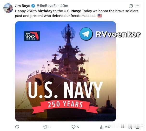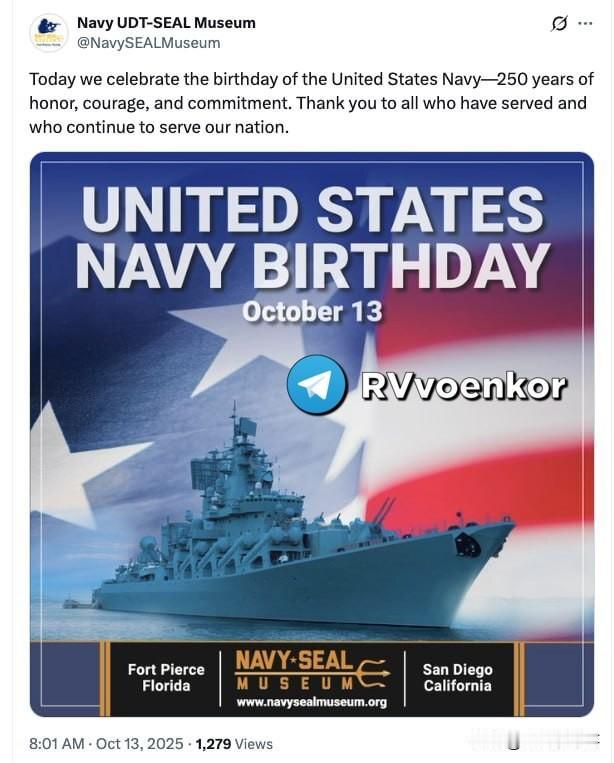🇺🇸❤️🇷🇺美国海军博物馆和参议员用俄罗斯导弹巡洋舰的照片祝贺美国海军成立250周年。 ▪️位于佛罗里达的美国海豹突击队国家博物馆发布了一张庆祝美国海军成立250周年的贺卡,上面使用的竟是俄罗斯“瓦良格”号导弹巡洋舰的图片。 ▪️美国《华尔街日报》作者大卫·布朗还发布了几条来自不同账号的祝贺美国海军250周年的消息,这些消息中使用了俄罗斯和苏联军舰的照片。在部分贺卡中,印度和丹麦的军舰被误认为是美国军舰。 ▪️佛罗里达州共和党参议员吉姆·博伊德使用了一张俄罗斯“彼得大帝”导弹巡洋舰的照片向美国海军致意。 ▪️美国众议员安迪·哈里斯(共和党,马里兰州),其简历显示他曾于1988年至2005年在美国海军医疗部队服役并达到指挥官军衔,他用印度军舰的照片祝贺海军250周年。 ➖“瓦良格”是1164型“亚特兰特”导弹巡洋舰,隶属于俄罗斯太平洋舰队。该舰于1983年下水。 俄战舰 俄海军舰艇 俄罗斯海军舰船