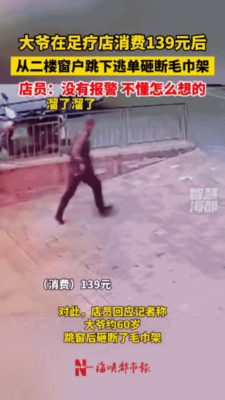 ???为139元从二楼跳窗逃单,这大爷是把“省钱”玩成不要命了? 内蒙古赤峰一60岁大爷,在足疗店消费139元后,直接从二楼窗户纵身跳下逃单,还把店里的毛巾架砸断了!店员对着监控直叹气:“一百来块钱,不懂他咋想的,最后也没报警……” 这哪是逃单啊,简直是拿命在省这一顿饭钱!二楼跳下来就算没摔出重伤,这行为也离谱到让人失语。店员倒是实诚,觉得一百多块报警没必要,可大爷这操作,是把“占便宜”刻进骨子里了? 都说老人大多淳朴节俭,可节俭到拿生命冒险逃139元单,这到底是啥逻辑?要是真摔出个三长两短,这足疗费怕是要变成天价医疗费吧! 大爷跳窗逃单 迷惑行为大赏 逃单天花板 你见过比这更离谱的逃单操作吗?评论区说说,这大爷到底图个啥?