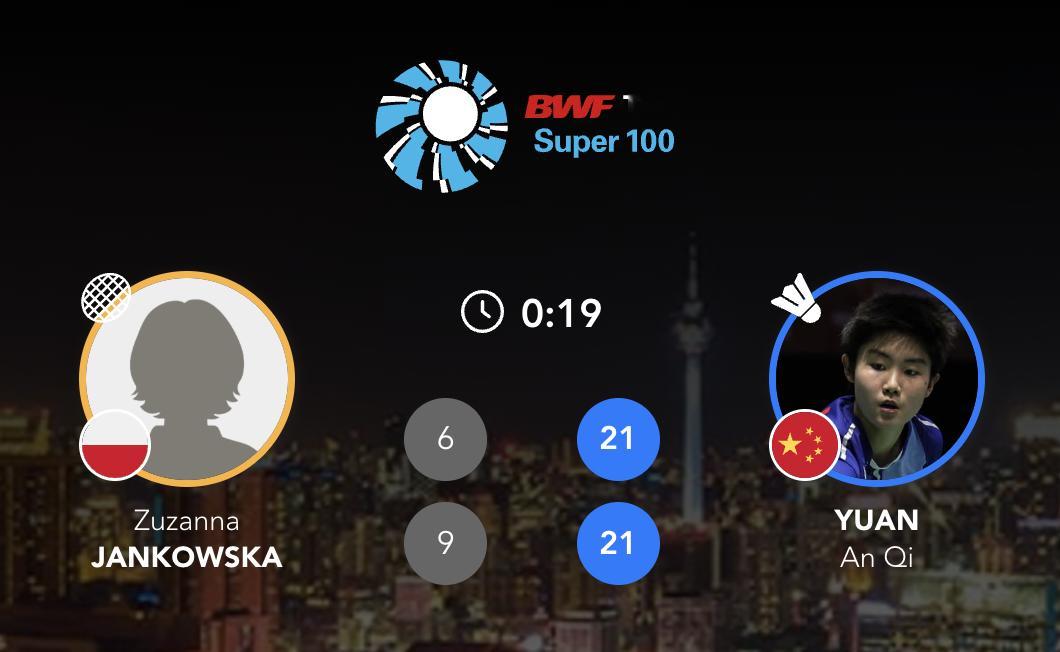 袁安琪🇨🇳 21-6、21-9 🇵🇱祖赞娜